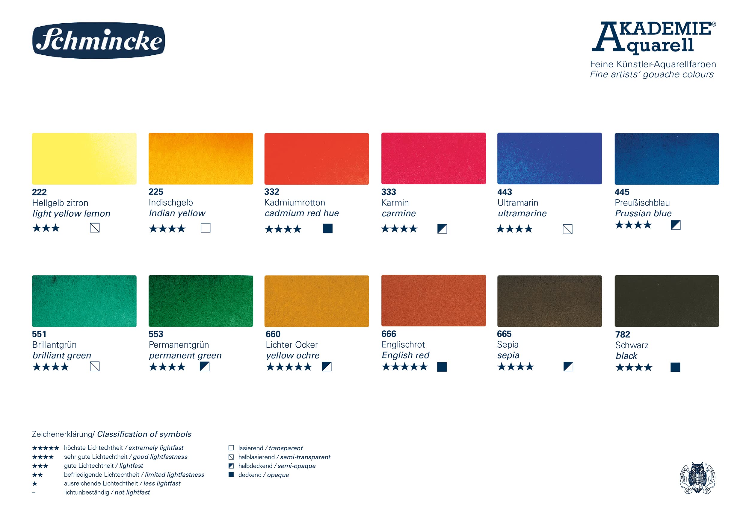 🎨 The complete AKADEMIEAquarell range contains a total of 24 colors. These can be mixed and combined with the HORADAM AQUARELL colors as well as with the AQUA bronzes and all AQUA mediums from Schmincke. All AKADEMIEAquarell colors are formulated cadmium-free.