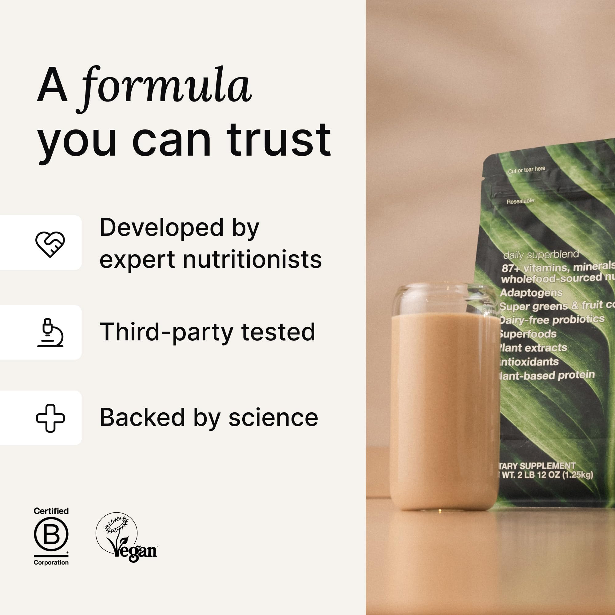 ULTIMATE SUPERFOOD MEAL: With more than 87 vitamins, minerals and wholefood-sourced nutrients, daily superblend is the perfect breakfast or mid-day energy boost.