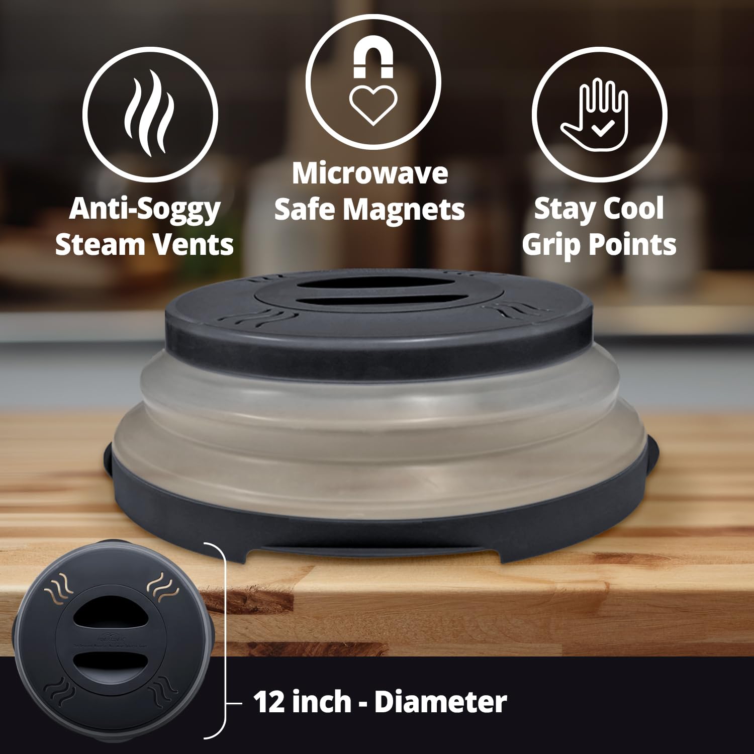 SPLATTER PROTECTION FOR A SPOTLESS MICROWAVE: Avoid spills and splatters while reheating or cooking with our 12 X 12 in Magnetic Microwave Food Cover. It features built-in magnets for convenience, simply pull down the cover from the microwave ceiling whenever needed. Its easy-grip handle and steam vents allow for an effective, even food heating that's also mess-free.