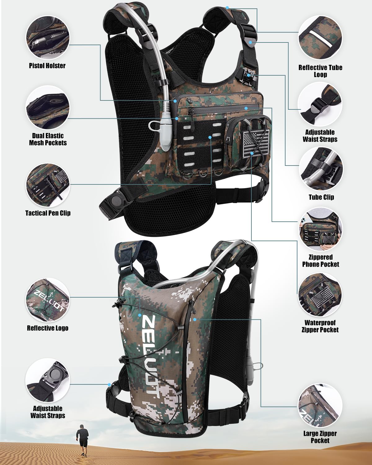 Adjustable Shoulder Straps & Waist Belt - The Zelvot running backpack is designed for optimal comfort, featuring widened adjustable shoulder straps to distribute weight evenly and reduce strain. The adjustable waist belt minimizes bounce and shifting, preventing chafing from an improper fit. The chest adjustability range of this running vest for women or men: XS/S: 25"-35", M/L: 29"- 41", making it adaptable to different body types