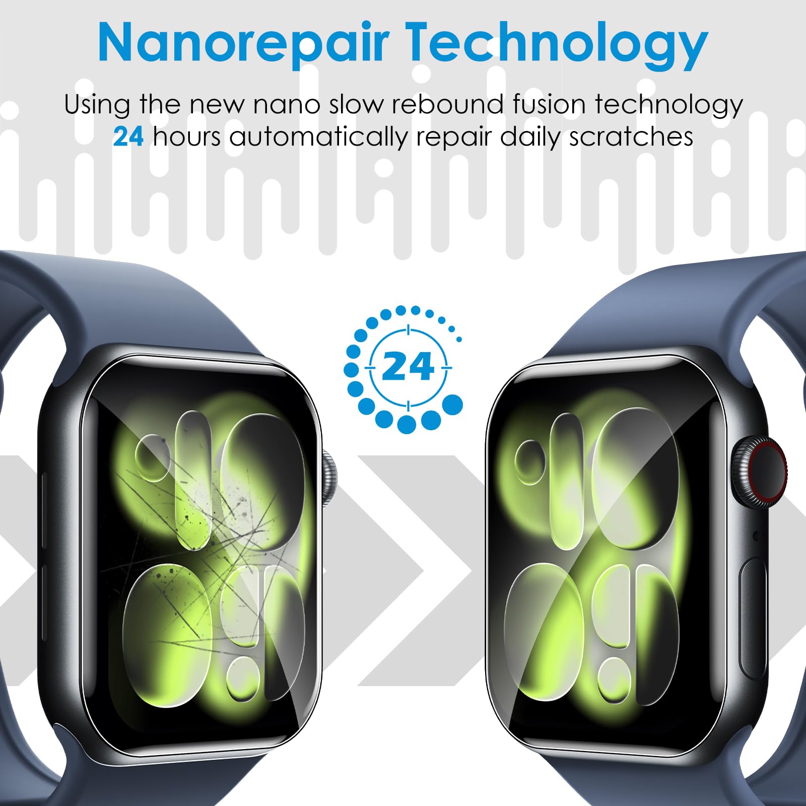 【No bubbles & Self-healing】 Ultra-thin protector allows for high watch responsiveness. The innovative process achieves no bubbles in Apple Watch 46mm screen protector and the revolutionary process makes it self-healing within 24 hours. UniqueMe screen protector is made of military-grade polyurethane, which can absorb shock, wear, and scratch, and provide comprehensive protection for your watch.