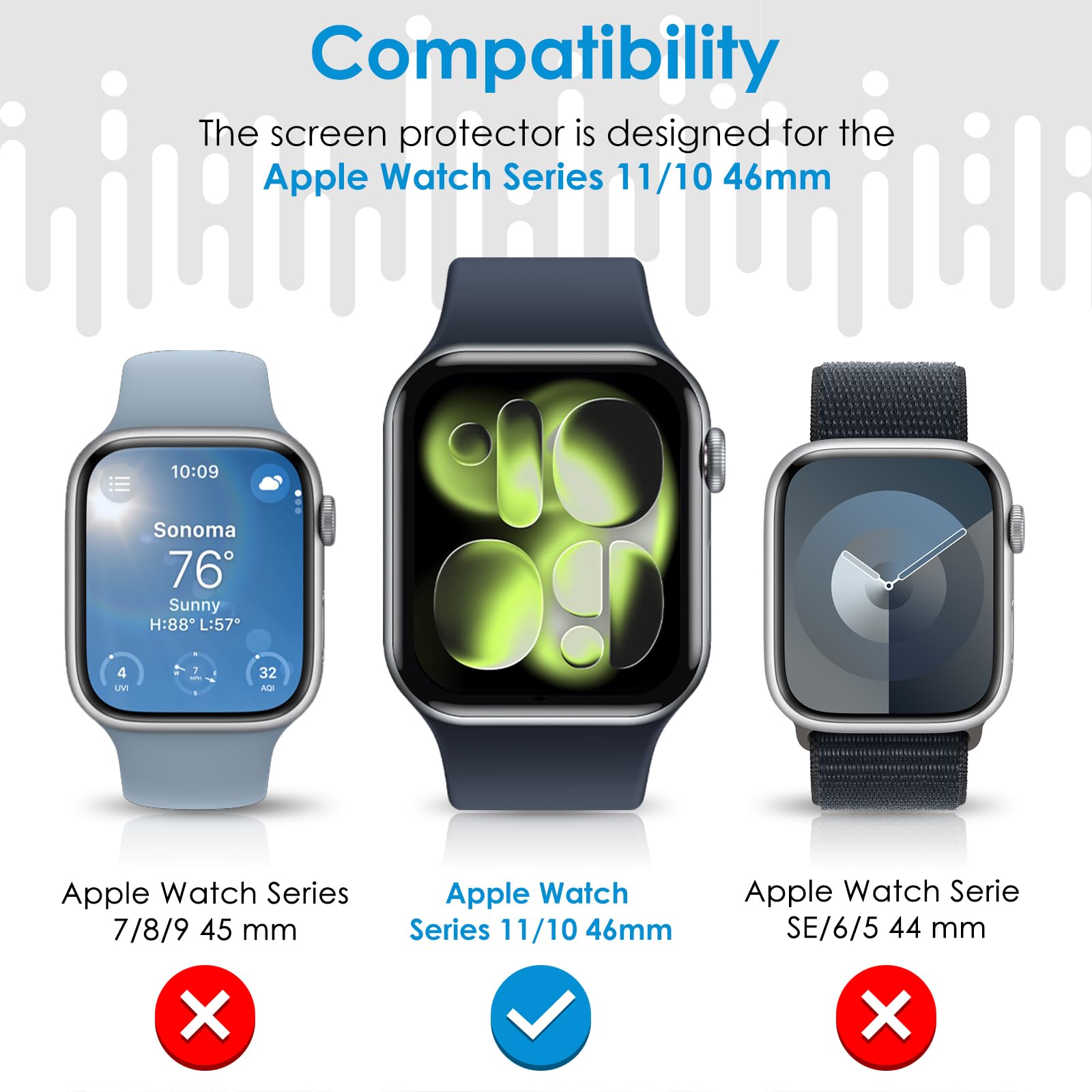 【Easy to Apply】This Apple Watch Screen Protector is only compatible with Apple Watch Series 10 / 11 46mm, not for any other models. UniqueMe offer an online instruction video, please watch our installation tutorial video for better installation,please use your thumb to press the edge to make it stick more firmly to the screen after installing. We provide lifetime service for all of our Apple Watch screen protector 46mm. If any problems with the Apple Watch screen protector please contact us.