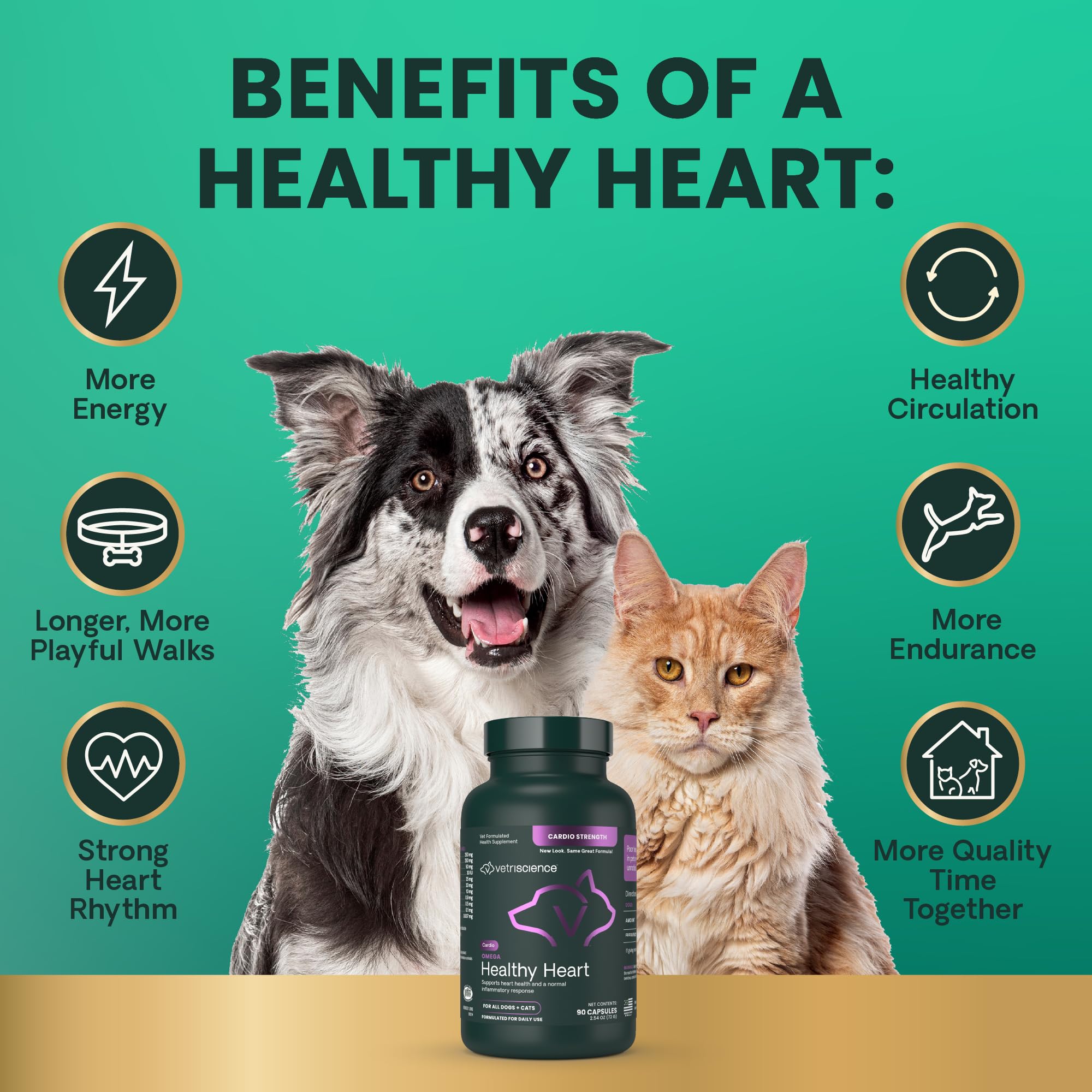 Support your pet’s cardiovascular health with Omega Healthy Heart (new name, same great Cardio Strength formula), a vet-formulated heart supplement for dogs and cats designed to promote heart muscle function, healthy circulation, and balanced heart rhythm. This advanced cardiac supplement for dogs and cats combines key ingredients like Omega-3s, L-Carnitine, Taurine, and Coenzyme Q10 to support energy production, heart muscle strength, and cellular protection. Omega fatty acids, including EPA and GLA, help manage triglyceride levels and promote healthy arteries, while essential vitamins and minerals like Vitamin E, Potassium, and Magnesium help support normal blood pressure and muscle function. Omega Healthy Heart is perfect for pets needing extra heart health support, especially seniors and breeds predisposed to heart issues. Convenient, unflavored capsules can be given whole, hidden in VetriScience Pinchers pill-hiding treats for dogs, or opened and sprinkled over meals for easy administration. Whether you have a cat, a dog, or both, this cardio support supplement delivers essential nutrients to keep your pet’s heart healthy and strong. For targeted liver and heart health, consider pairing with VetriScience Liver Health supplements for dogs and cats. Trust Omega Healthy Heart—a leading heart support supplement for dogs and cats designed by veterinarians for optimal cardiovascular wellness. Our dog and cat supplements are certified by the National Animal Supplement Council (NASC), routinely undergo third-party testing, and contain no hidden ingredients, artificial flavors, synthetic colors or preservatives.