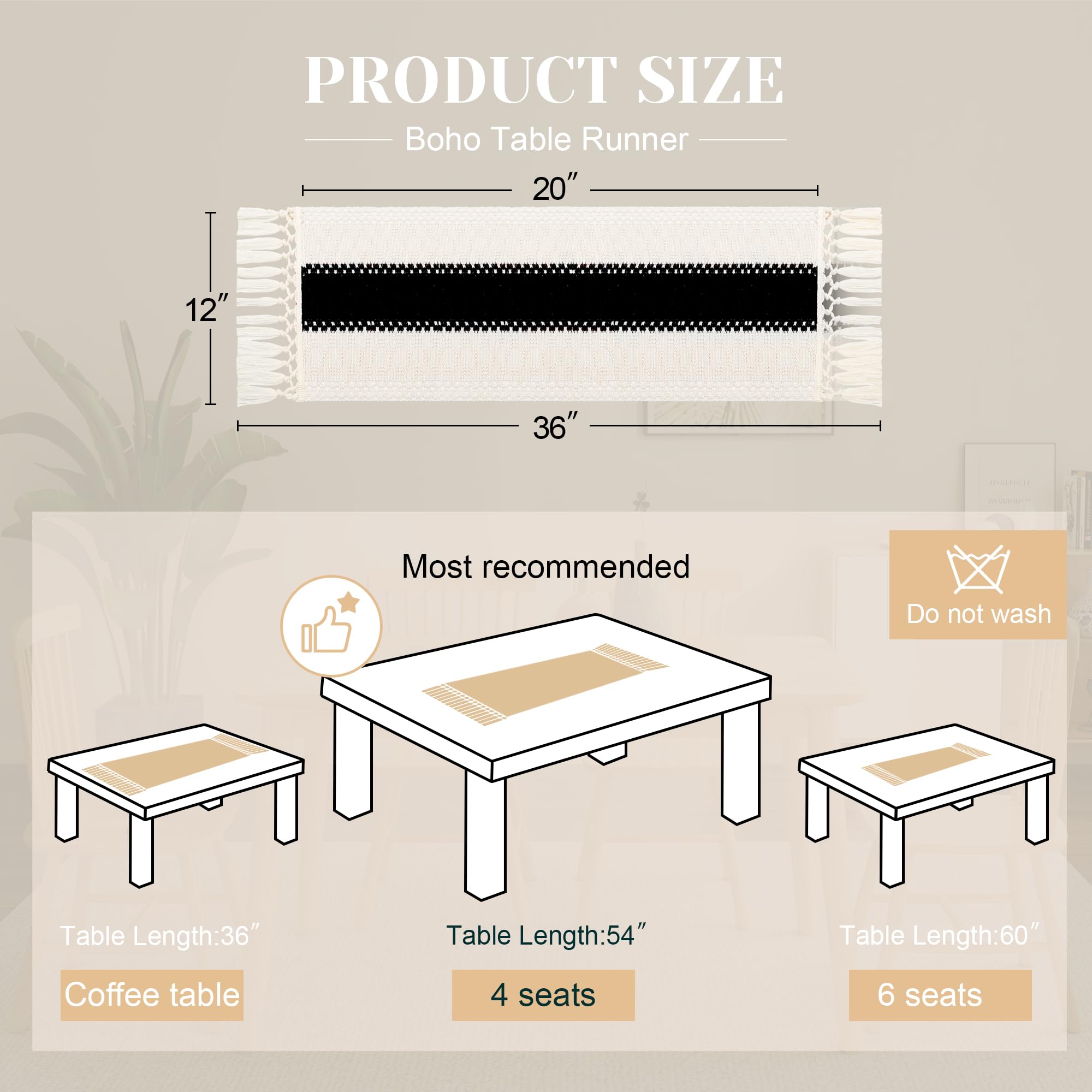 [Perfect 36 Inches Long] Our macrame table runner with tassels measures 12 x 36inch, fits a dining table that seats 4-8 people. It can give your tables a rustic and boho look. (Because it is folded in the bag, when you take it out, the table runner will have creases, which will affect your measurement. So, please make sure the table runner is placed neatly and flat before measuring)