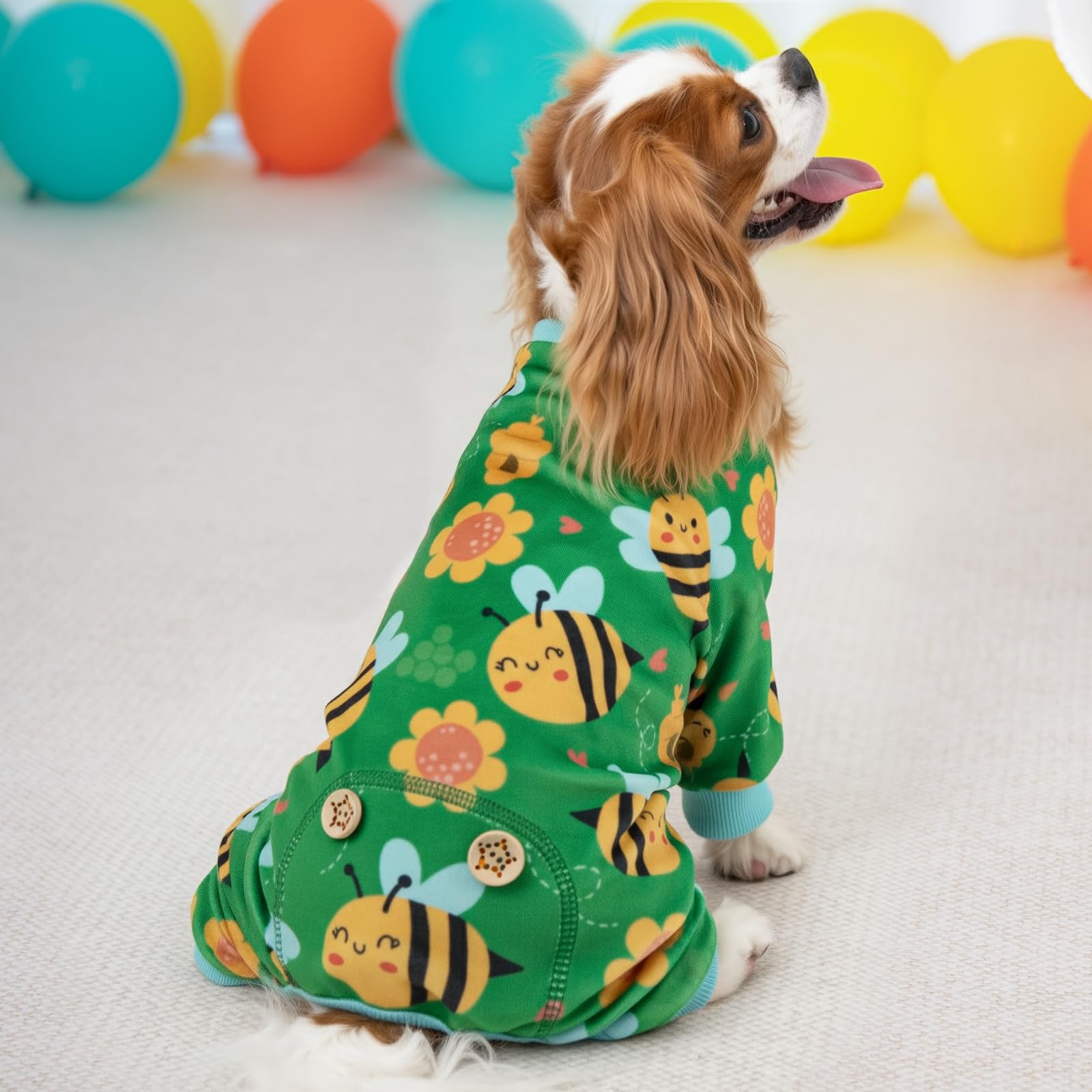 Dog pajamas in Little Bee printing, is made of soft stretchable velvet, very comfy for your dog's dailywear. Pullover design dog pjs, easy to put on and off