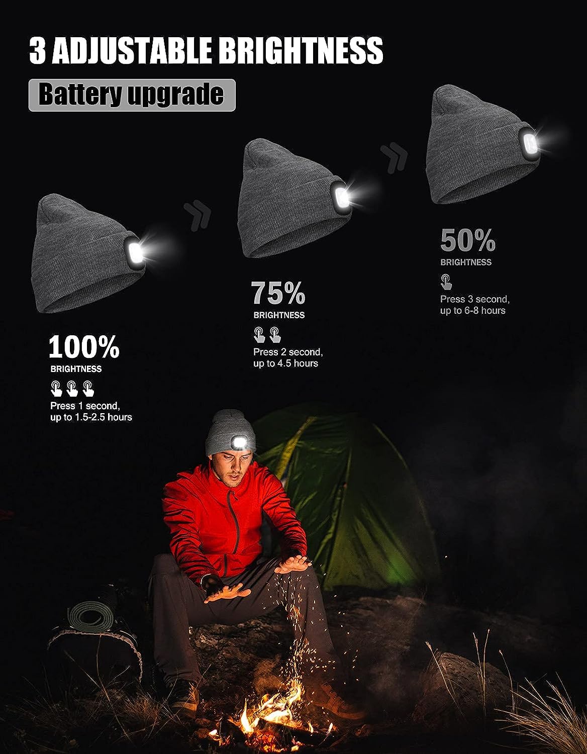 The LED lights inserted into the beanie cap contains four (4) bulbs and is easily removable. With three (3) adjustable brightness settings. Providing 120 Lumens and up to 4 hours of continuous use or 6-8 hours of realistic intermittent use. Lighted Beanie Cap Provides incredible hands-free lighting for finding your way in the dark or completing tasks in poorly lit environments.