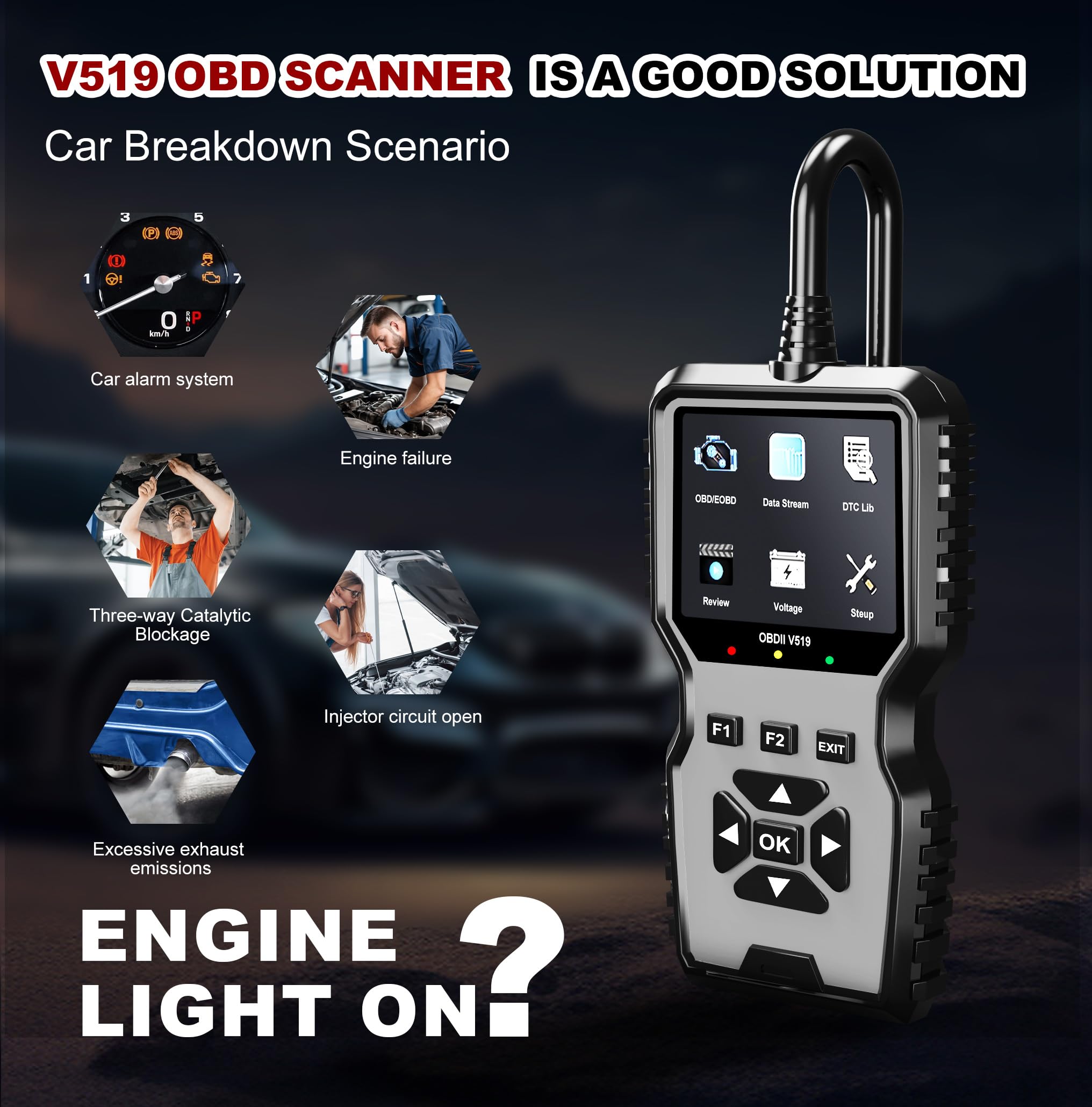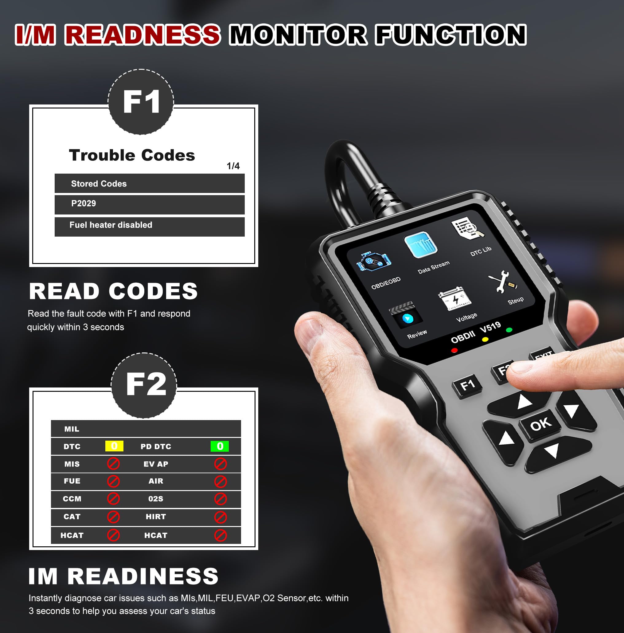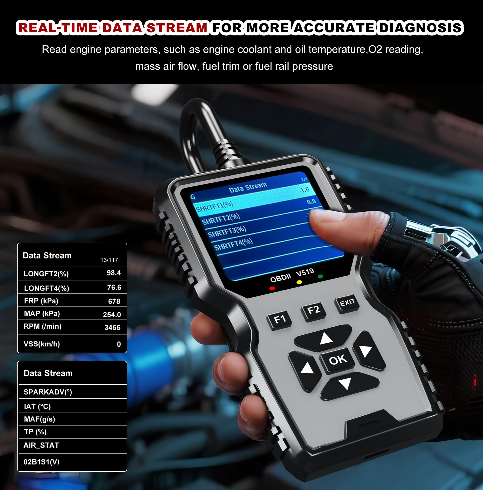 Full OBDII Modes Scanner for Car: The V519 is a professional car scanner equipped with all the necessary OBD2 functions. It can read and clear codes, turn off the engine light or MIL, view freeze frame data, check I/M readiness, retrieve vehicle VIN, test battery voltage, display live data stream with graphing, has 35901 built-in DTCs, perform O2 sensor tests, enable onboard monitoring mode, and conduct component testing
