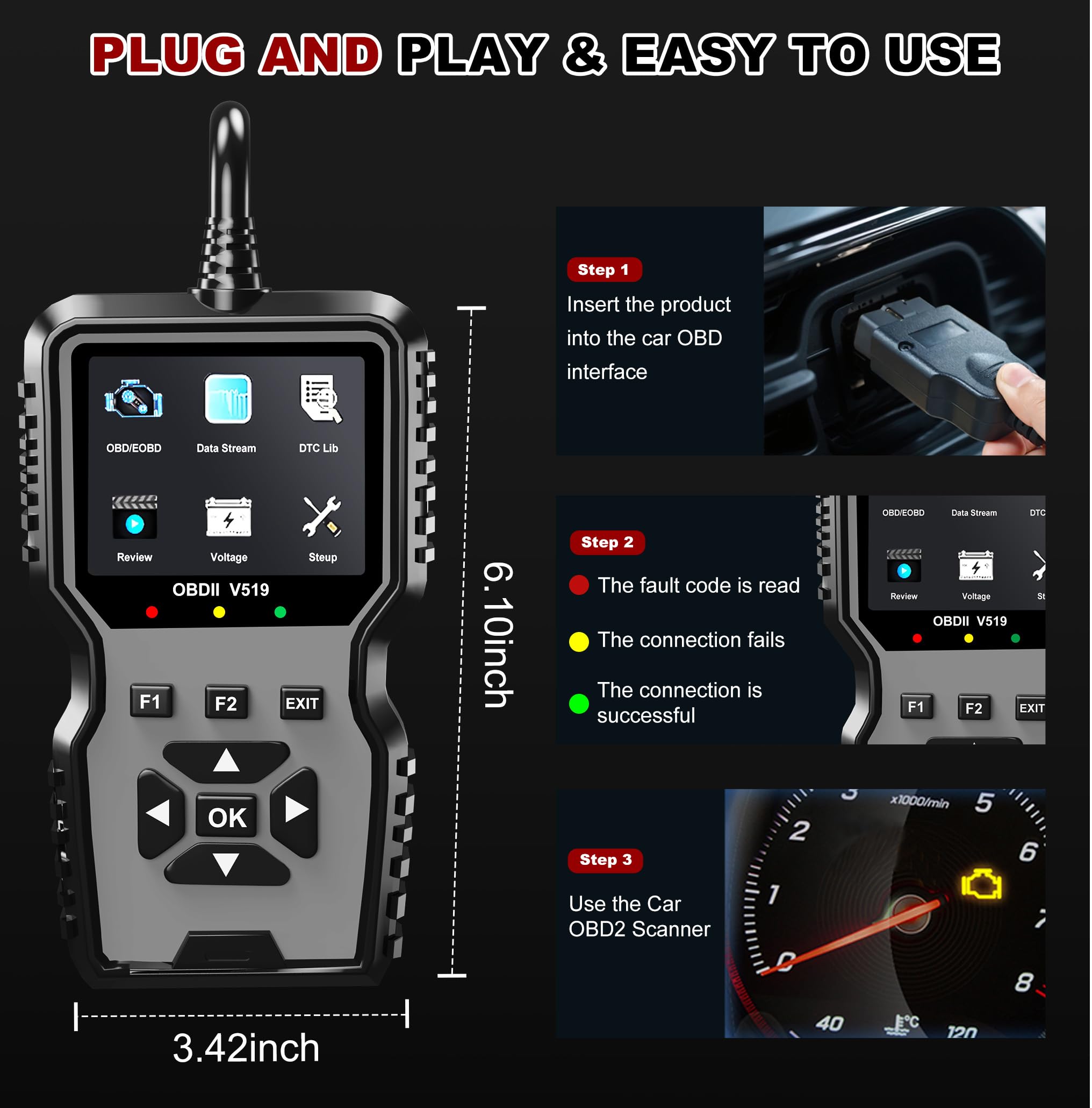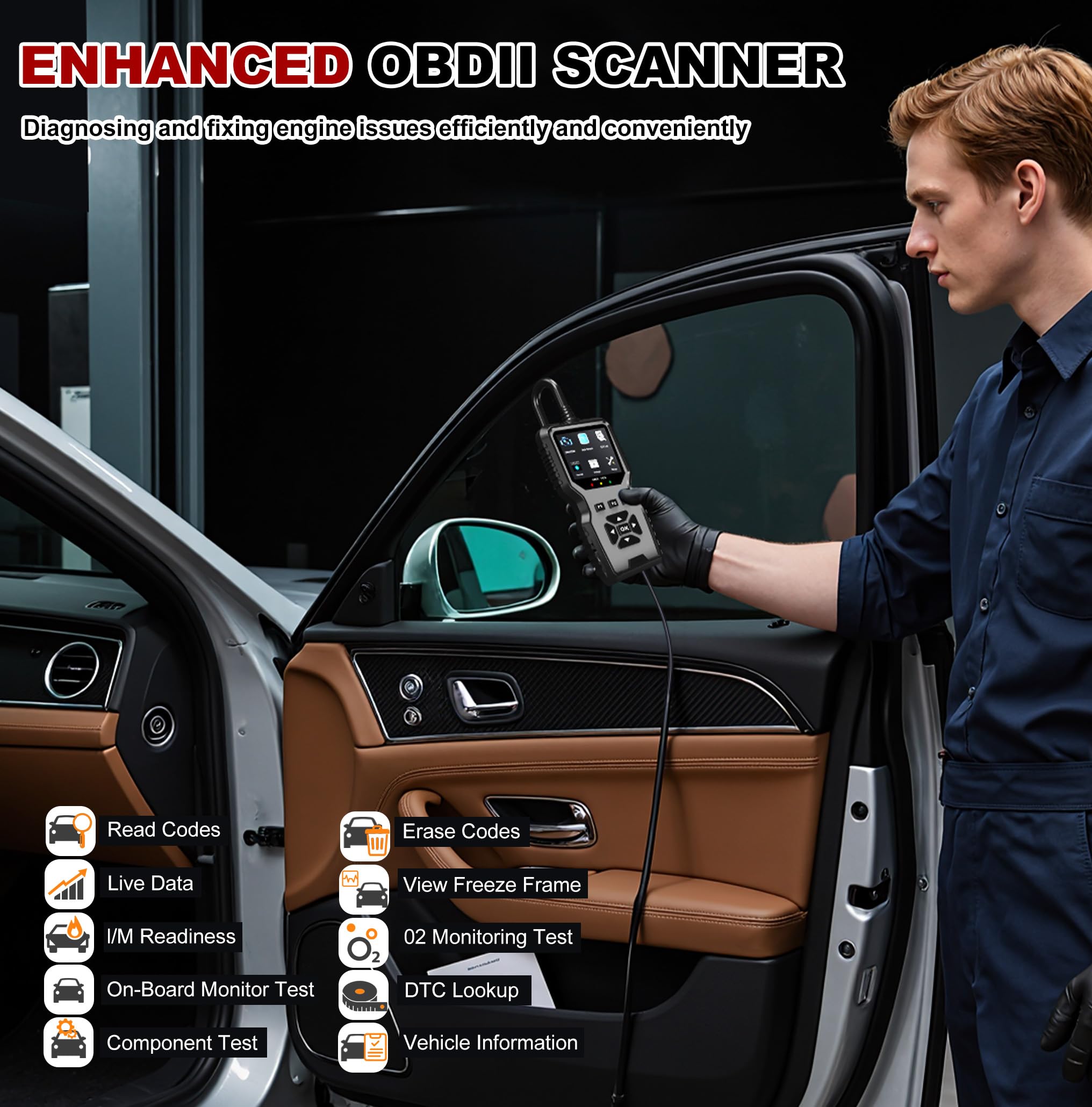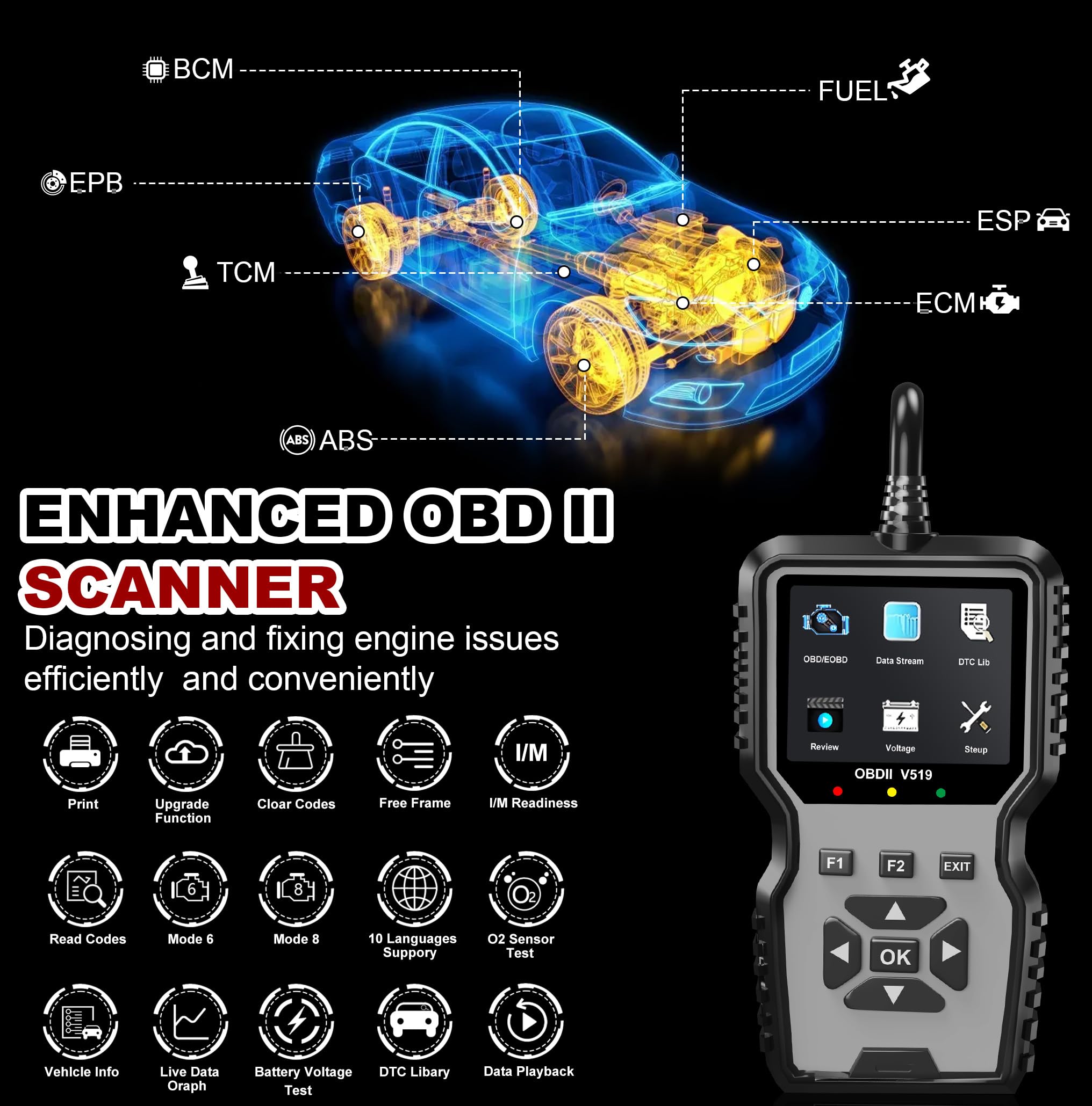 Diagnostic OBD2 Scanner Tool Compatible with 98% Vehicles And Multiple Languages: The code reader OBD2 scanner for cars is designed to be compatible with most vehicles manufactured after 1996 US-Based, 2002 EU-Based and 2008 Asian cars. If your car has a 16-pin OBD2 port and was produced within the specified timeline, it should be compatible with the code reader and the obd2 scanner diagnostic tool support for 10 languages: English, French, Spanish, German, Chinese, Russian, Italian, Japanese, Portuguese, Dutch, which make it easy to use for people from different countries.