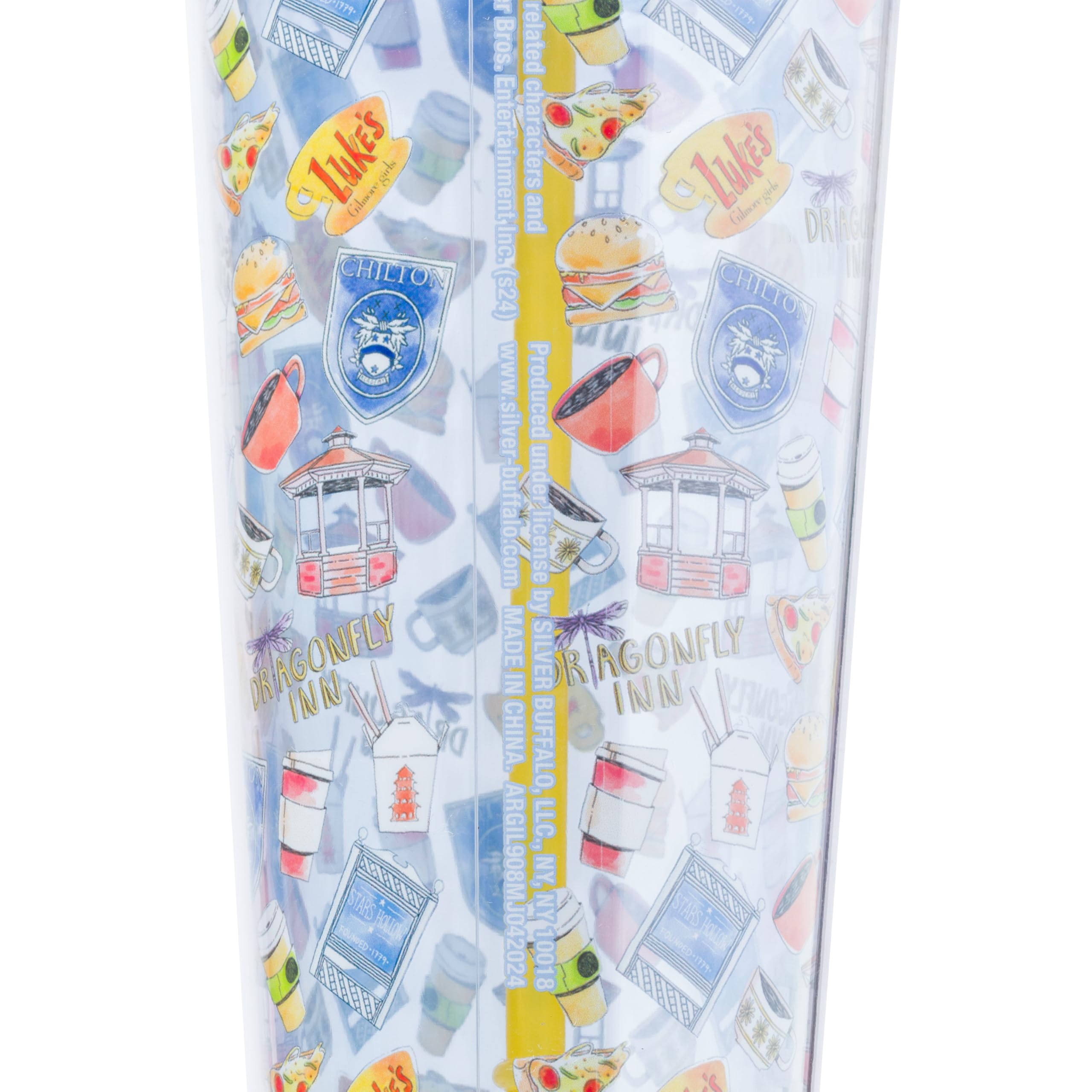 GILMORE GIRLS: Themed cold cup features iconic Gilmore Girls images including Luke’s Diner, Stars Hollow, Chilton, and the Dragonfly Inn. Images are scattered throughout the cup. Cold cup is complete with a Luke’s Diner straw topper.