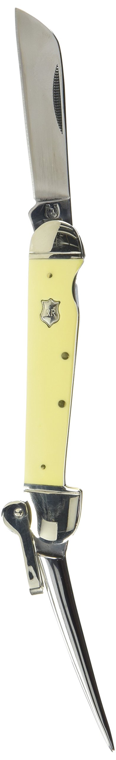 Smooth yellow synthetic handles. 4 1/2" closed. 440 stainless sheep foot blade and marlin spike. Nickel silver bolsters and inlay shield. Shackle.