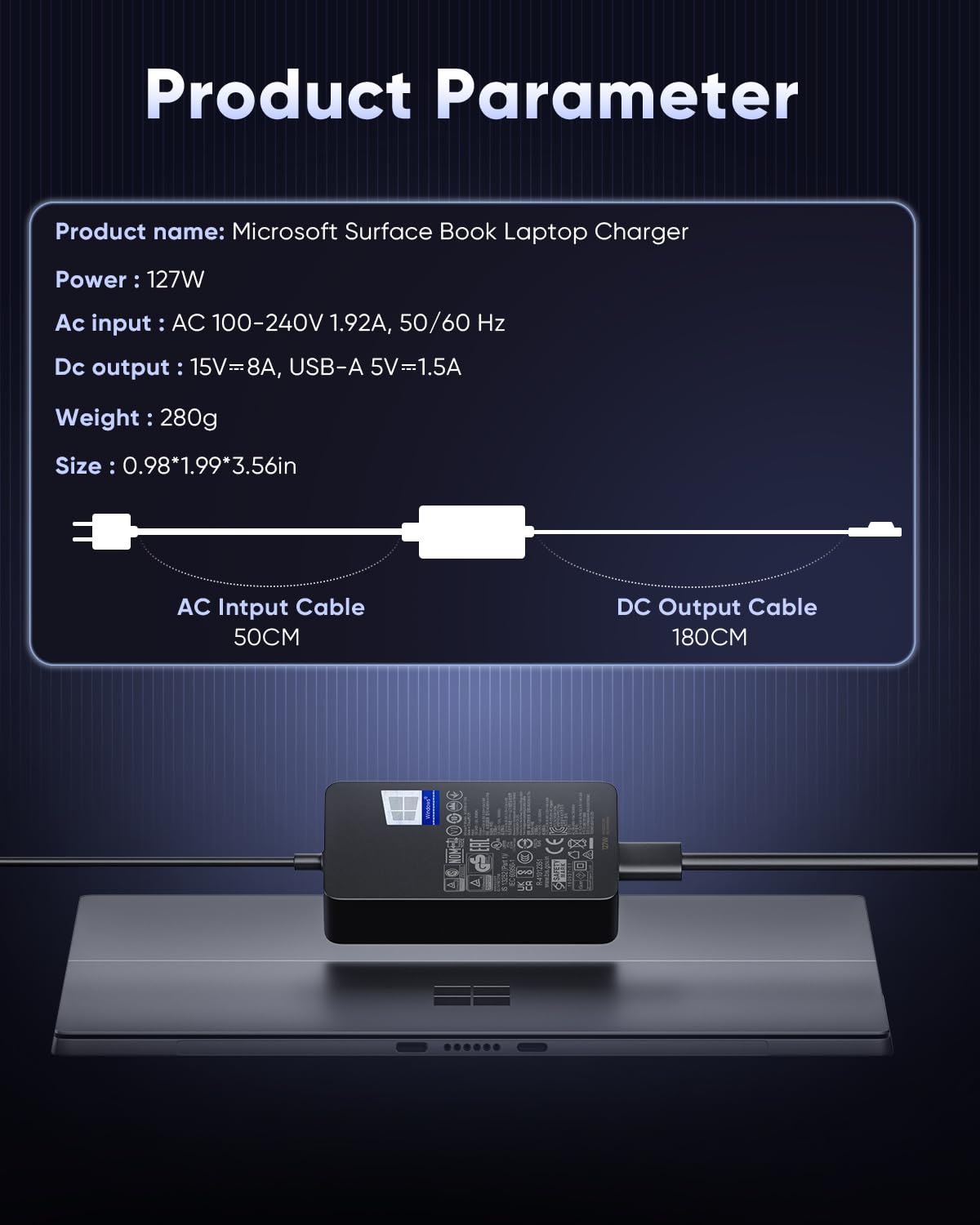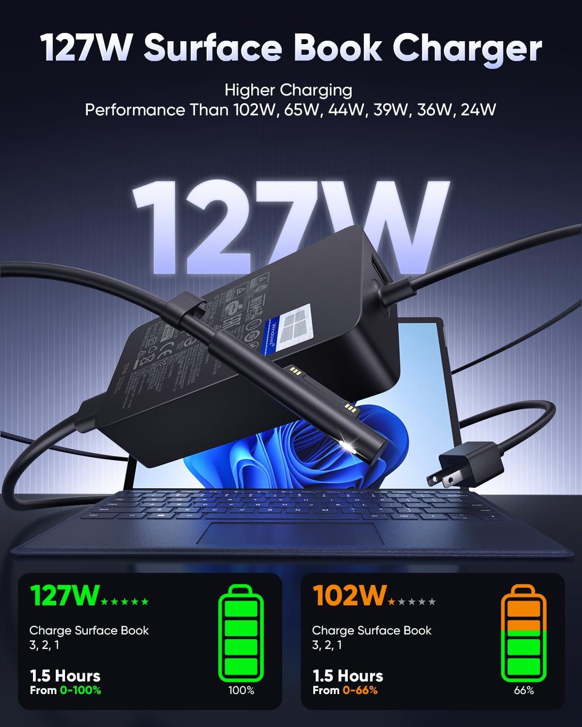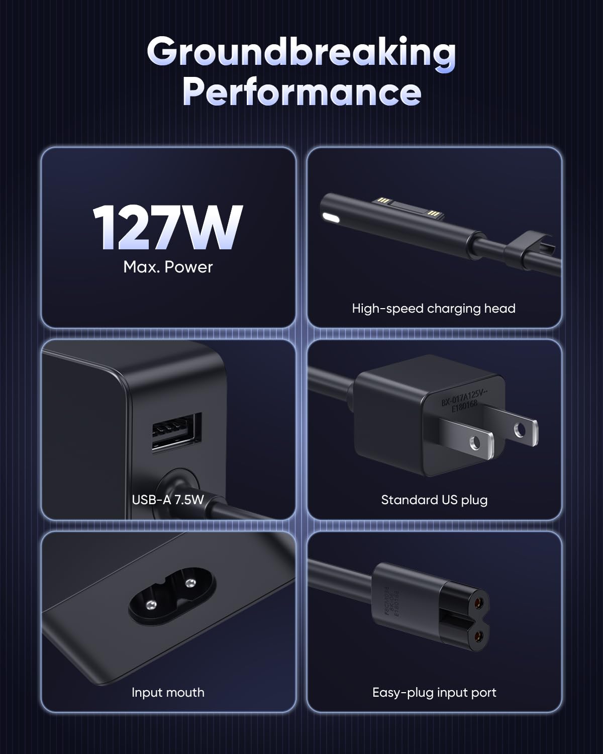 Fast Charge Your Surface: thanks to a 127W max output, it can intelligently output 127W, 102W, 65W, 44W, 39W, 36W, 24W according to your surface and provide higher charging performance at the mean time, battery level increase even while playing, with a USB port simultaneous charging your Surface and cellphone