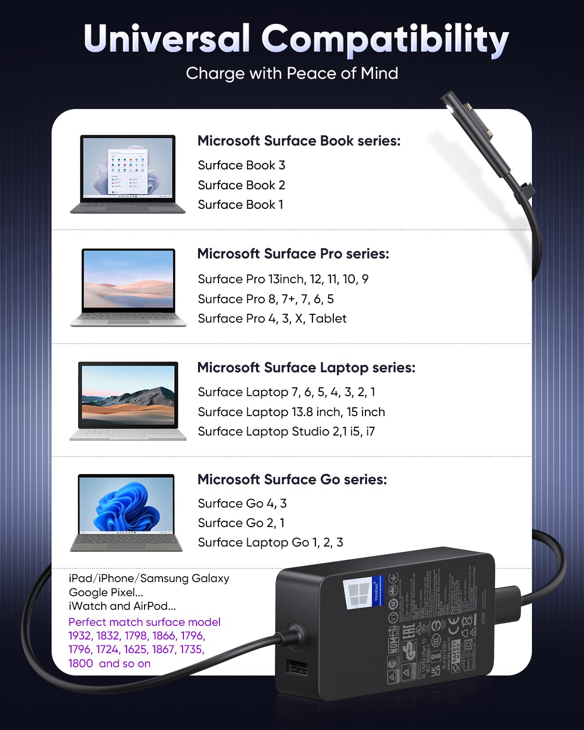 Widely Compatibility: perfect match surface model 1932, 1832, 1798, 1706, 1866, 1796, 1724, 1867 and so on, compatible with Microsoft Surface Book 3, 2, 1, Surface Laptop Studio 2, 1, Windows Surface Pro 10, 9, 8, 7+, 7, 6, 5, 4, 3, X, Surface Laptop 6, 5, 4, 3, 2, 1, Surface Go 3, 2, 1, Surface Laptop Go, iPhone, iPad, Samsung Galaxy, Google Pixel