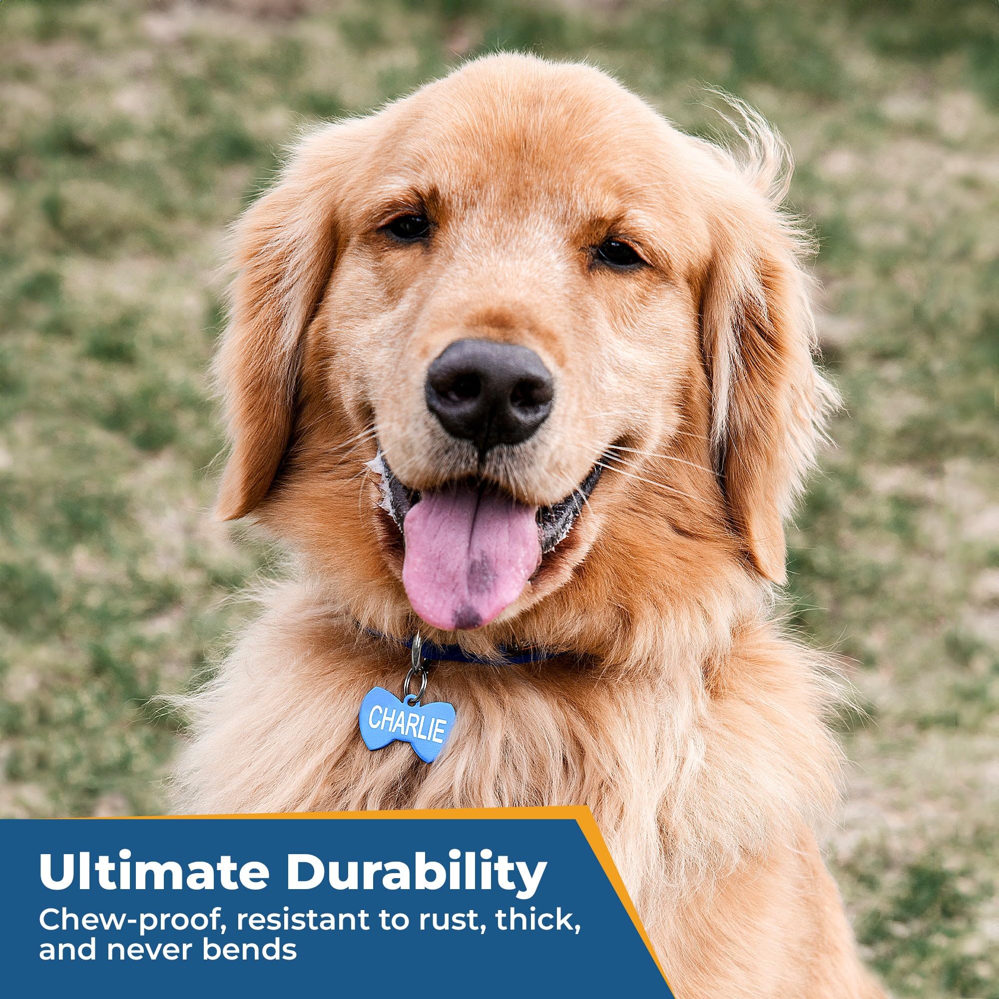 Permanently laser engraved with 2-sided engraving and up to 8 lines of personalized text. With 4 lines on both front and back, there is plenty of room for all of your pet's important information. Our aluminum tags go through an anodized process that adds strength, durability and brightness of color to each tag. Clear, sharp and easy to read personalization. Split ring included.