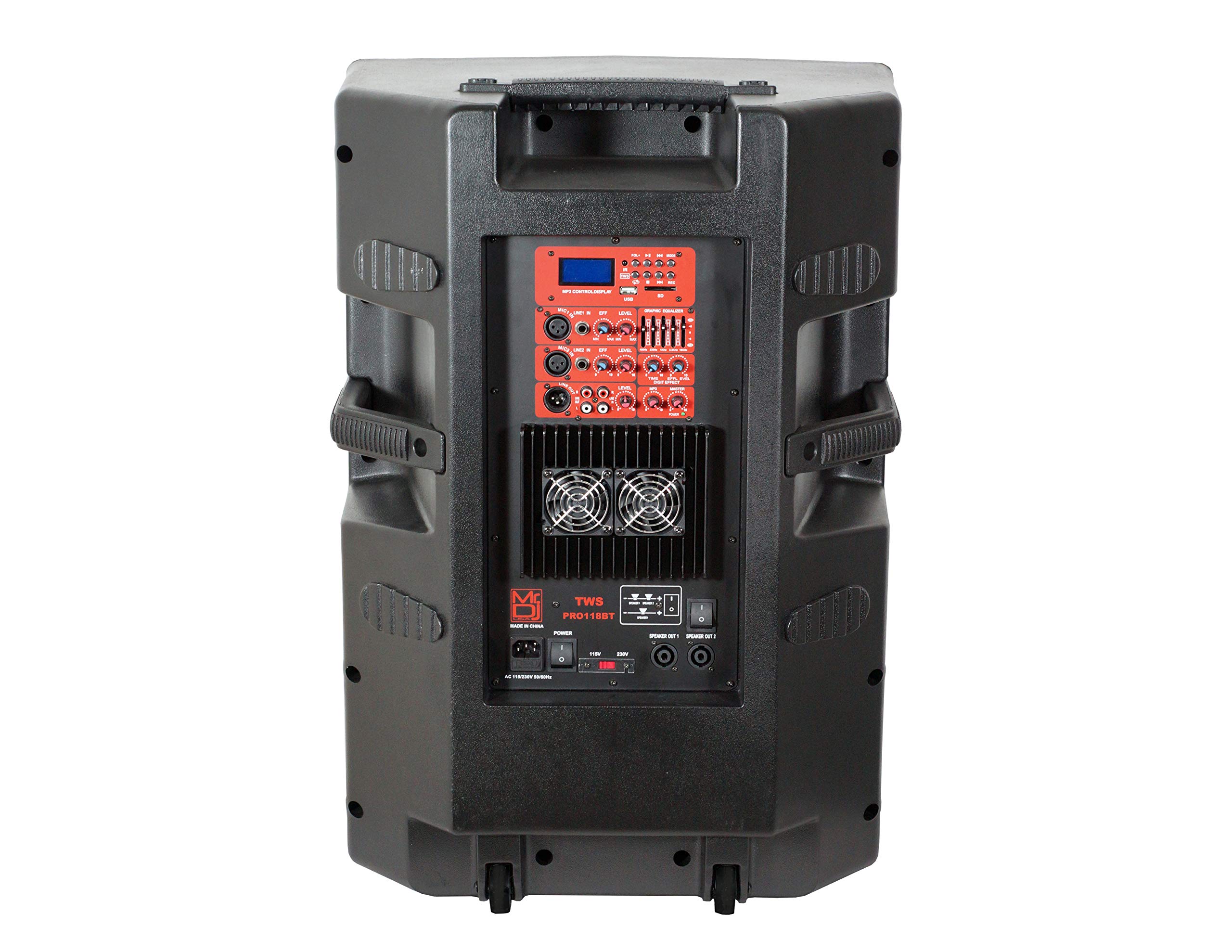 Mr. Dj PRO118BT 2-way 18" PRO PA/DJ bass-reflex Bluetooth active amplified speaker, 5500 watts P.M.P.O. Mr. DJ PRO118BT Speaker provides durability, flexibility, and excellent audio performance with exceptional range. This 5500-Watt P.M.P.O 18” 2-way powered speaker system delivers distortion-free sound even at extreme SPL. The amplifier is equipped with an internal switch-mode power supply for low distortion audio with a superior transient response. 5-Band Graphic Equalizer allows you to custom tailor your sound to your venue by boosting and cutting specific frequencies to improve sound quality. This speaker is perfect for home entertainment, indoors or outdoor activities, and/or events. Built-in Bluetooth receiver allows you to easily connect and play audio from most Bluetooth-enabled devices. Equipped with a USB flash drive and SD card reader, Mic Input: XLR or 1/4", Line Input: XLR or RCA allows you to connect an External Audio Device, Line Output: XLR or 1/4" for External Audio Device, Built-in LCD display with selection controls, and IR Remote Control. Product Features: 2-way bass-reflex active speaker, max power 5500 watts P.M.P.O built-in Bluetooth technology and TWS system , MP3, USB, SD card reader heavy duty braided jacketing over PVC skins, for rugged durability line output XLR or 1/4" jack for external audio device, mp3 control, digital LCD, and remote control Professional Bi-Amplified PA Speaker System Included Remote Control and 3 Meter Power Cord Master Volume, Treble, and Bass Controls Master 5-Band Equalizer LCD Indicator Display with Menu Handle & Wheels for Easy Mobility woofer 18" 70 oz magnet 3" voice coil tweeter 1.75" compression driver 5500 watts P.M.P.O., 400 watts RMS total Ti Diap compressor driver class d amplifier 1 remote control ⚠️Warning: Cancer and Reproductive Harm-www.P65Warnings.ca.gov