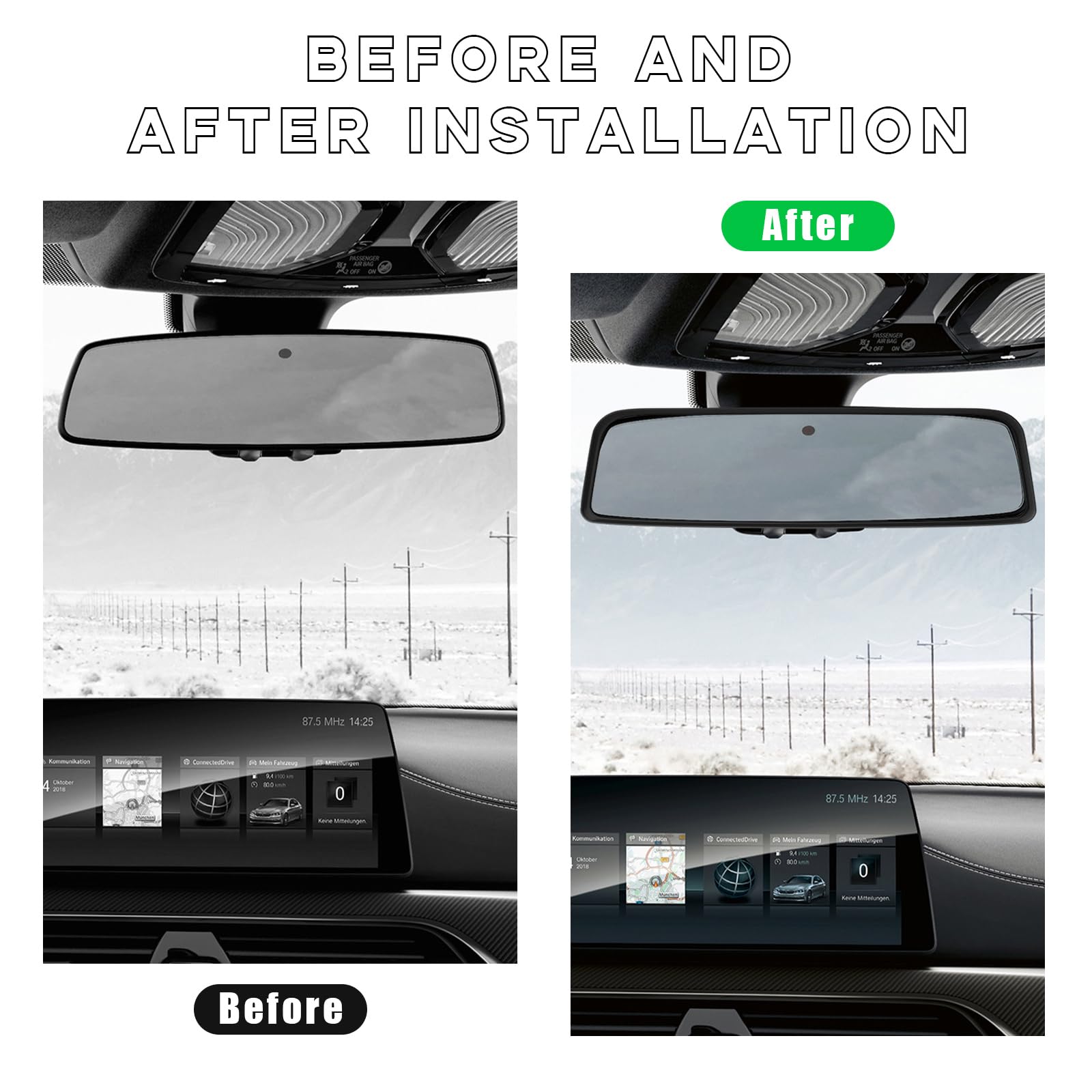 【Mounting Method】: This product adopts recessed installation. All you have to do is to put the product along the edge of the car rearview mirror, which takes only a few seconds. It has a thin edge that won't get in the way of the rearview mirror screen and affect your ability to see what's behind you.