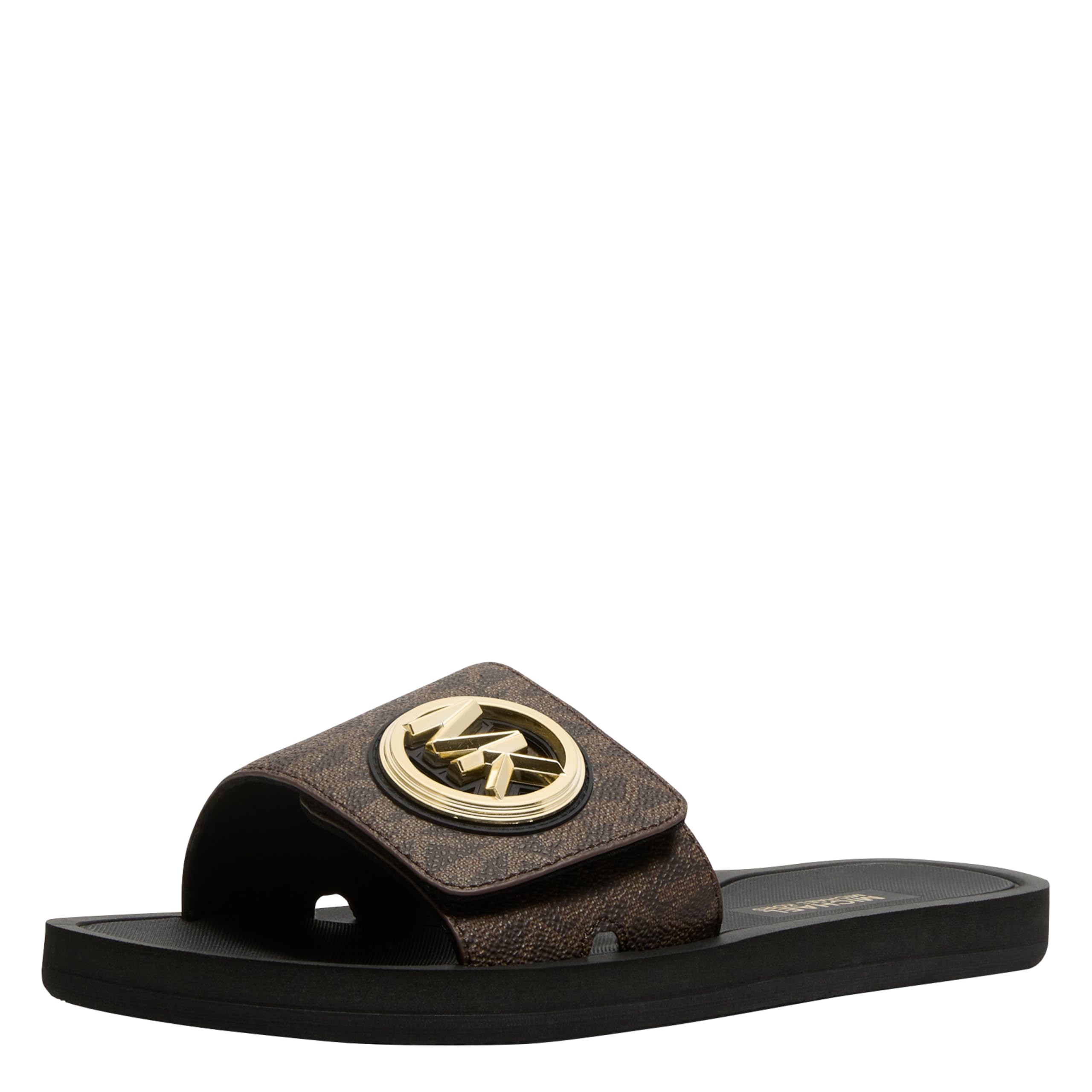 Signature Logo Strap: Wide strap crafted from logo-print canvas and finished with polished hardware, delivering a bold, recognizable look that elevates this casual slide with signature Michael Kors style