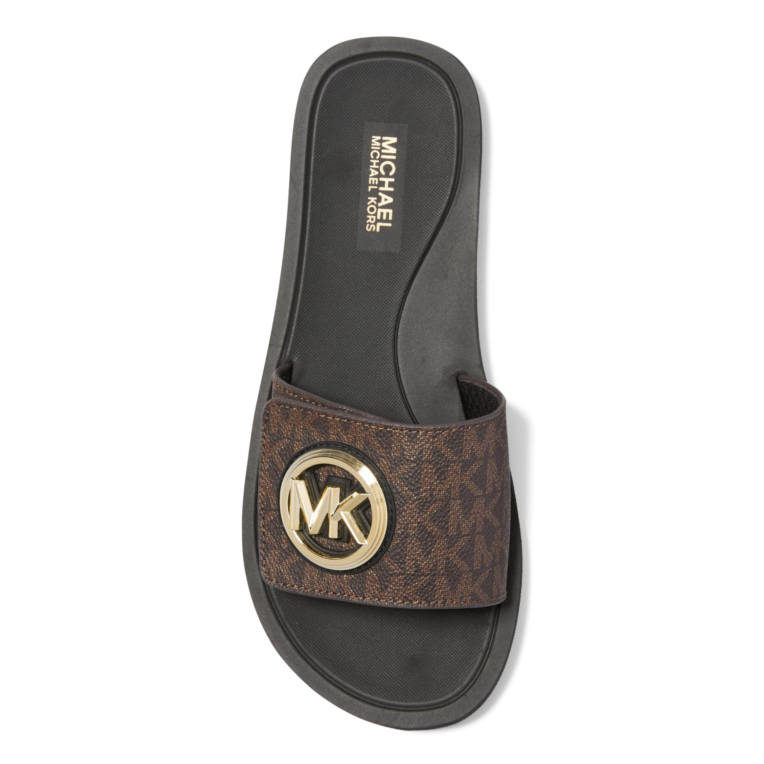 Description Pool slide sandal with MK circle stacked charm hardware on molded footbed.
