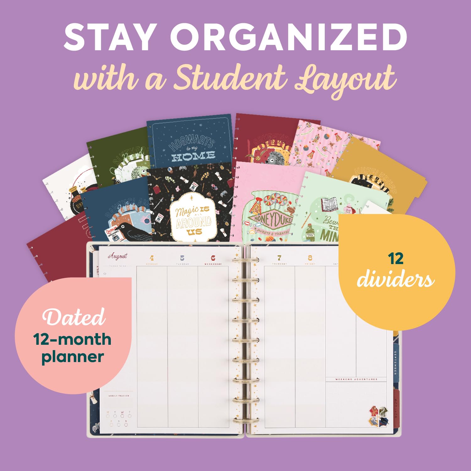 DESIGN: This school planner comes with 12 months of calendars and weekly spreads. The 12 dividers feature enchanting Hogwarts artwork, and the sturdy laminated covers protect the pages so your plans can go anywhere life takes you.