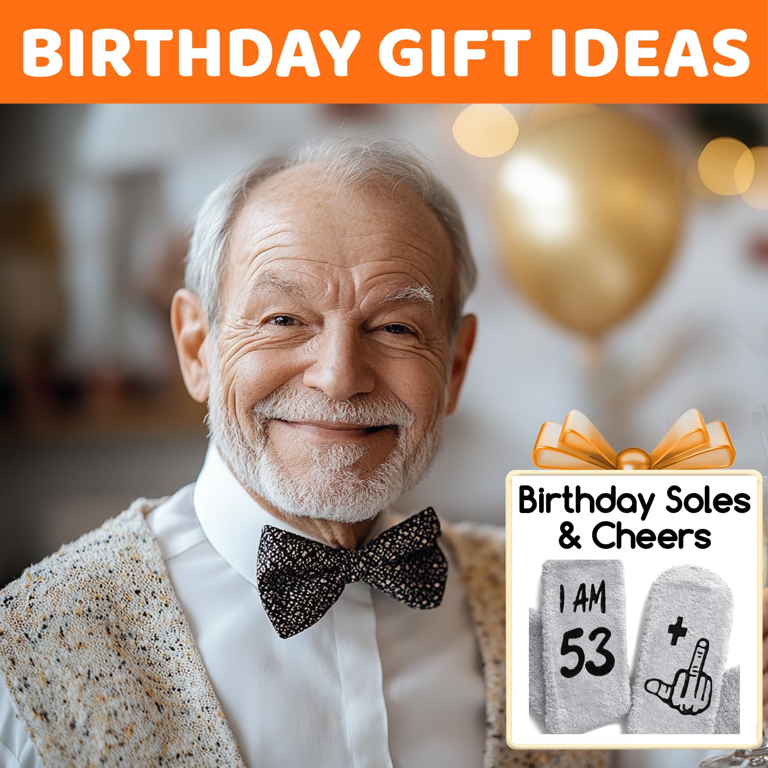 GIFTS FOR MEN IN THEIR 54S: "I AM 53+." Say it with socks - These are suitable for any holiday gifts, like Birthday gifts, White Elephant gifts, Christmas gifts, Fathers Day gifts.