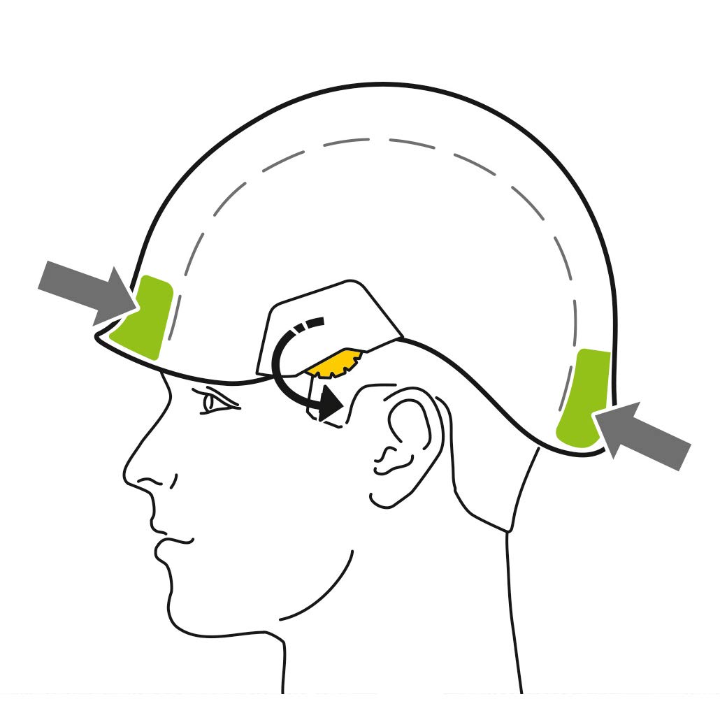 Protection designed for work at height and on the ground: - DUAL chinstrap allows the worker to adjust chinstrap strength in order to adapt the helmet to different environments: work at height (EN 12492) or on the ground (EN 397). The clip has two positions, corresponding to these two uses: high strength, limiting the risk of losing the helmet during a fall, and low strength, limiting the risk of strangulation if the helmet is snagged while the user is on the ground