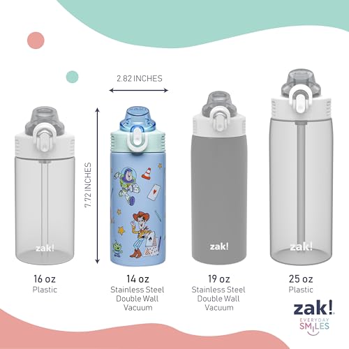 Let kids enjoy hydration with a fun Toy Story water bottle by zak! designs! Easy to Clean: The silicone spout and straw can be removed from the lid, and the pieces are top rack dishwasher safe for simple cleanup at the end of the day. Drinks Stay Cold: Vacuum insulation keeps beverages cold for longer, and also stops condensation from forming on the outside and leaving messy water rings. Reusable and Durable Material: Reusable water bottles will last wash after wash—good news for you and the environment! The 14 oz water bottle is made of stainless steel, durable enough for kids to use every day and bring on any adventure. Leak-Proof Lid for On the Go: The lid screws on securely and won't leak when the spout is closed, though water flows for easy drinking when the spout is open. The easy-open button has a flip-up lock to keep it from activating accidentally. It can be tossed into a bag for worry-free travel or carried by the handle built into the lid. Specifications: 14 oz capacity. Made of durable stainless steel. BPA-Free - zak! is committed to safety. Top rack dishwasher safe, do not microwave. Length: 4.30-inch, Width: 2.82-inch, Height: 7.72-inch. Character: Sheriff Woody, Buzz Lightyear, Jessie, Bullseye, Bo Peep, Rex, Aliens (Disney and Pixar's Toy Story).