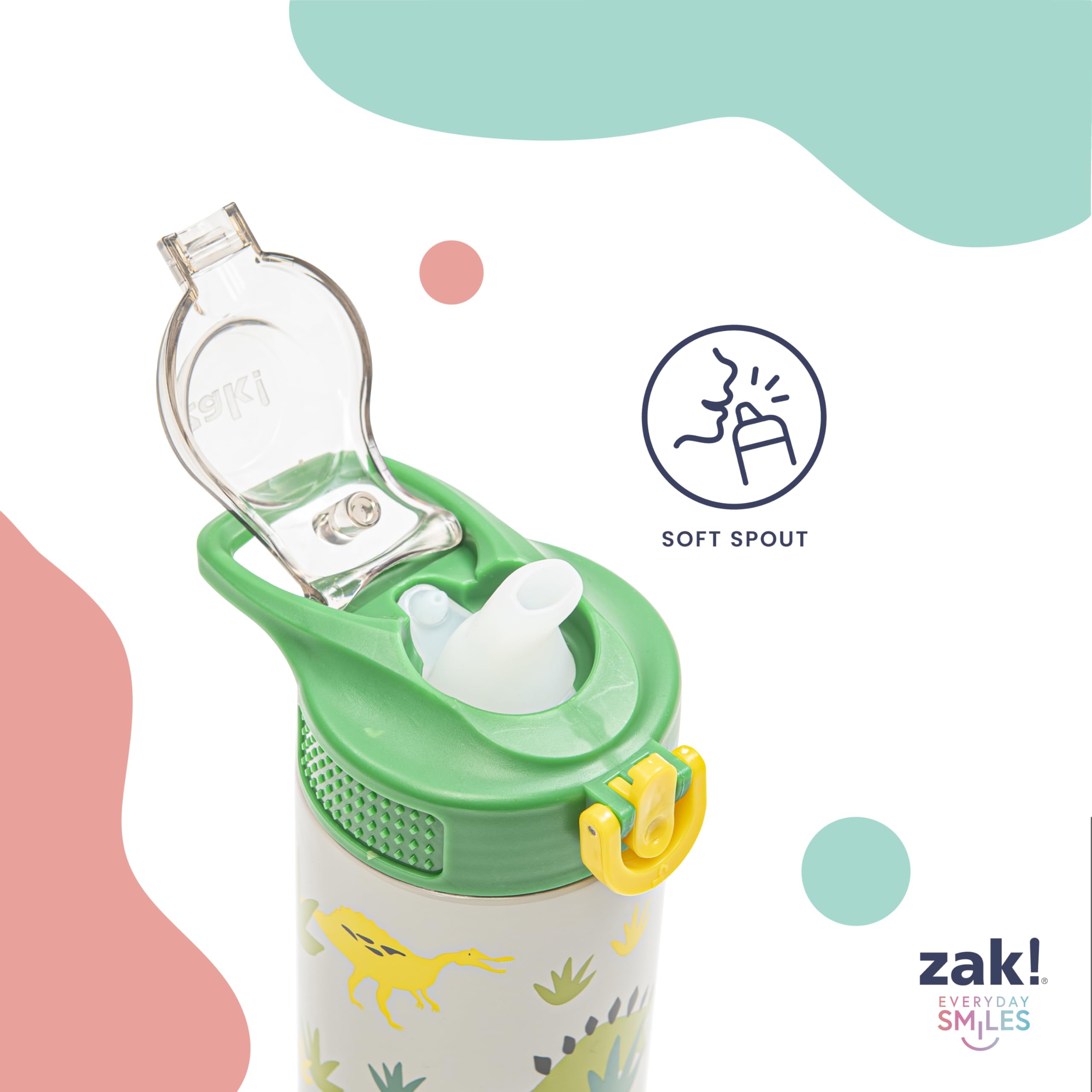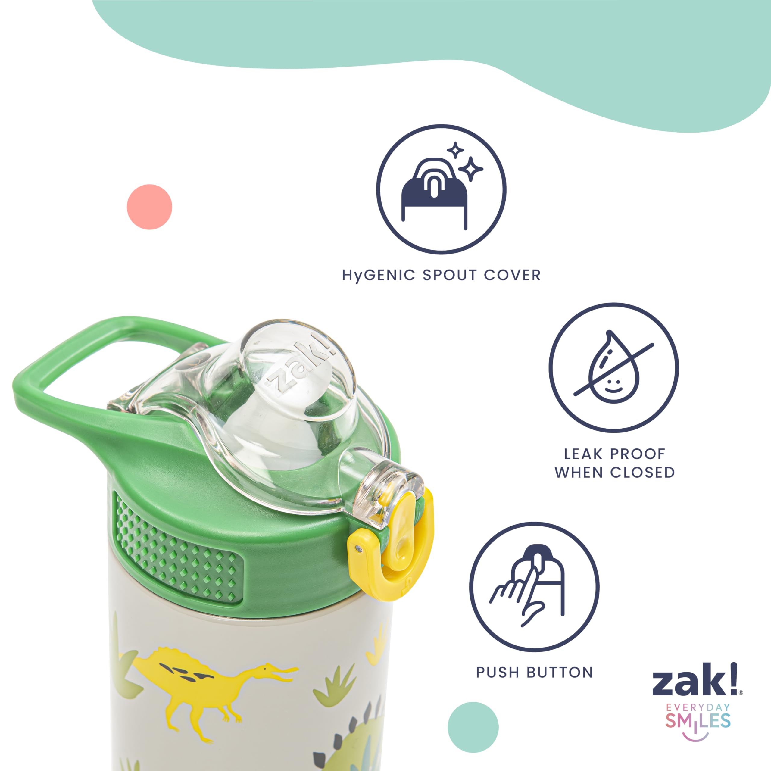 SIZE & MATERIAL: This Zak water bottle has a 14-ounce capacity, measuring 4.30 by 2.82 inches wide and 7.72 inches tall. It's made of durable, break-resistant, and BPA-free stainless steel, and recommended for children age 3 and up.