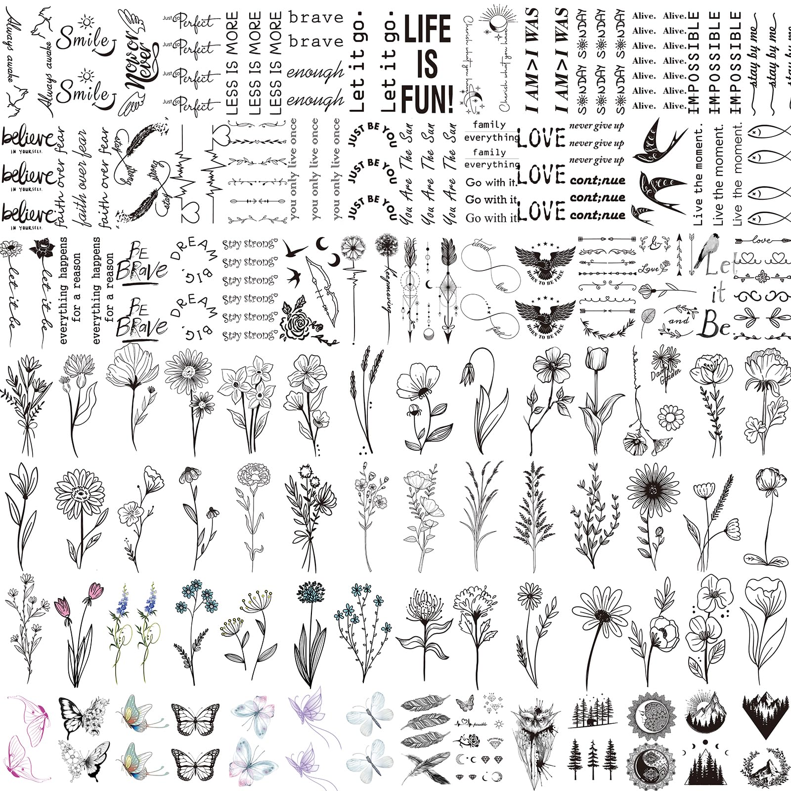 ❥【MORE QUANTITY KIDS TATTOOS】100 Sheets 240+ Pcs realistic temporary tattoos for women adult and kids, include 40 sheets inspirational words tattoos, 60 sheets wild flower floral tattoos stickers, size 4.1''x2.4''. Much quantity fake tattoos party favors are enough for you share it with your family and friends.