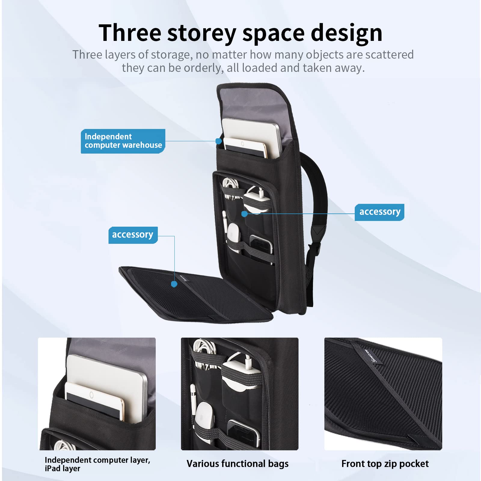 Independent Compartment: can hold a 16 inch notebook computer and 1 tablet. The compartment on the front of the pack and the net pocket on the front cover can store your accessories such as a mouse, cable, charger, adapter, etc
