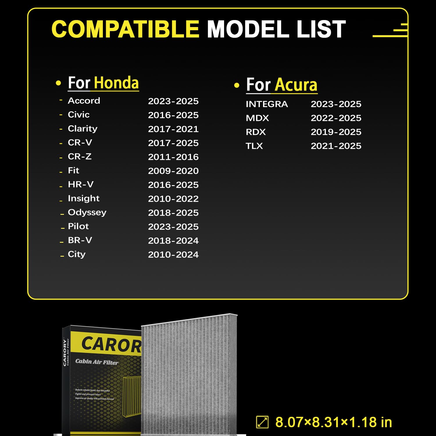 [Vehicle Fitment]: Compatible with Honda: Accord (2023-2025), Civic (2016-2025), Clarity (2017-2021), CR-V (2017-2025), CR-Z (2011-2016), Fit (2009-2020), HR-V (2016-2025), Insight (2010-2022), Odyssey (2018-2025), Pilot (2023-2025), BR-V (2018-2024), City (2010-2024). Acura: INTEGRA (2023-2025), MDX (2022-2025), RDX (2019-2025), TLX (2021-2025).