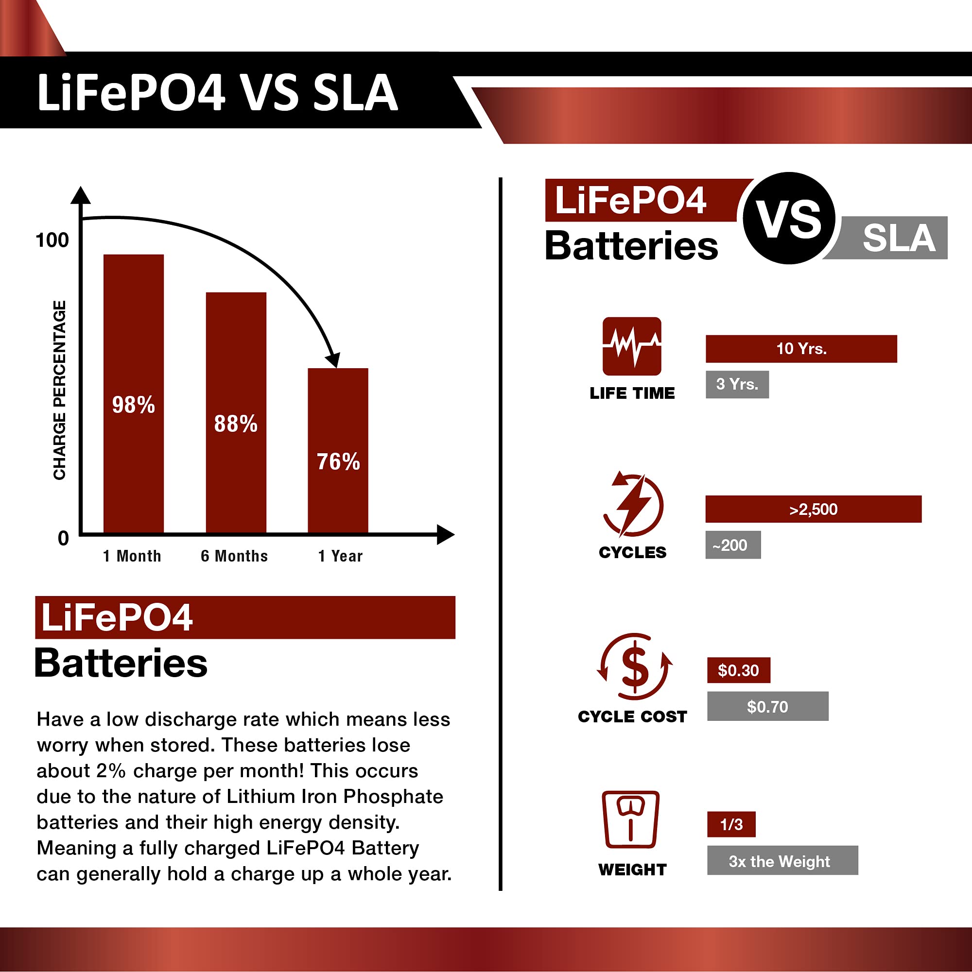 Complete Protection: The lithium battery’s unique built-in Battery Management System (BMS) protects it from overcharge, deep discharge, overloading, overheating and short circuit, and excessive low self-discharge rate ensuring up to 1 year maintenance-free storage. Built-in low-temp cut off prevents charging under 23 °F (-5 °C).