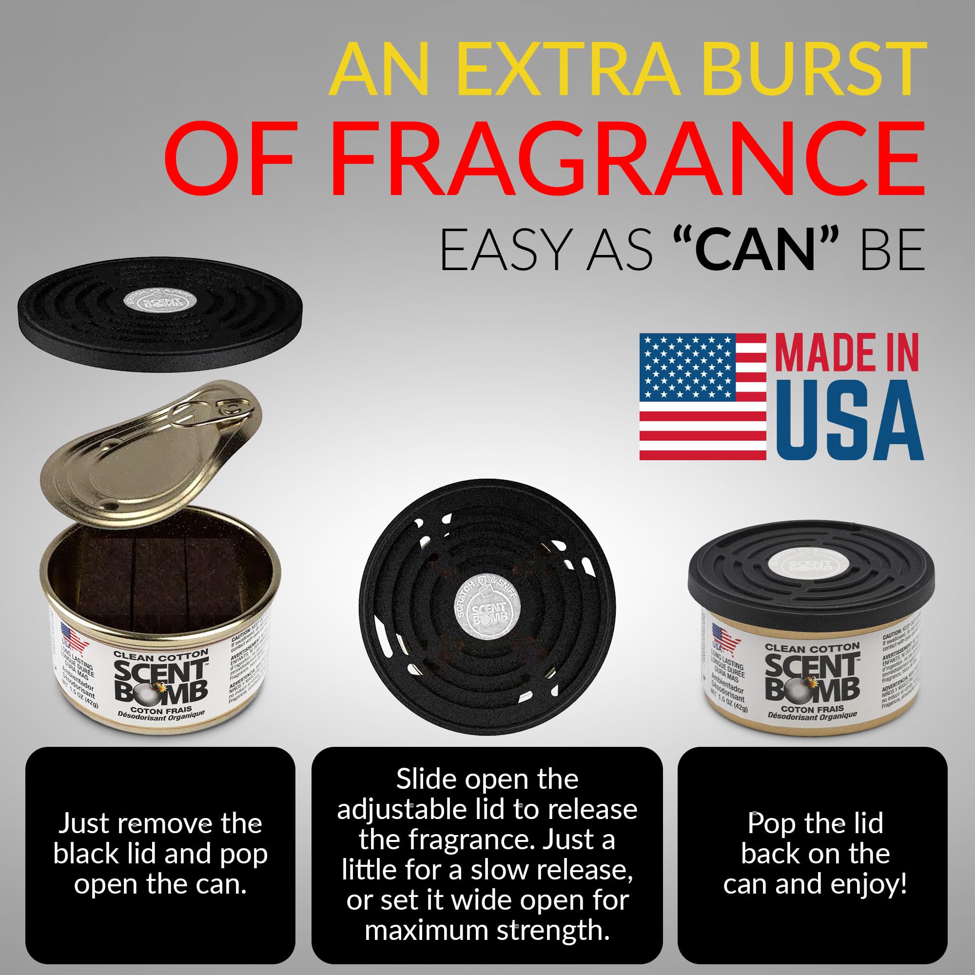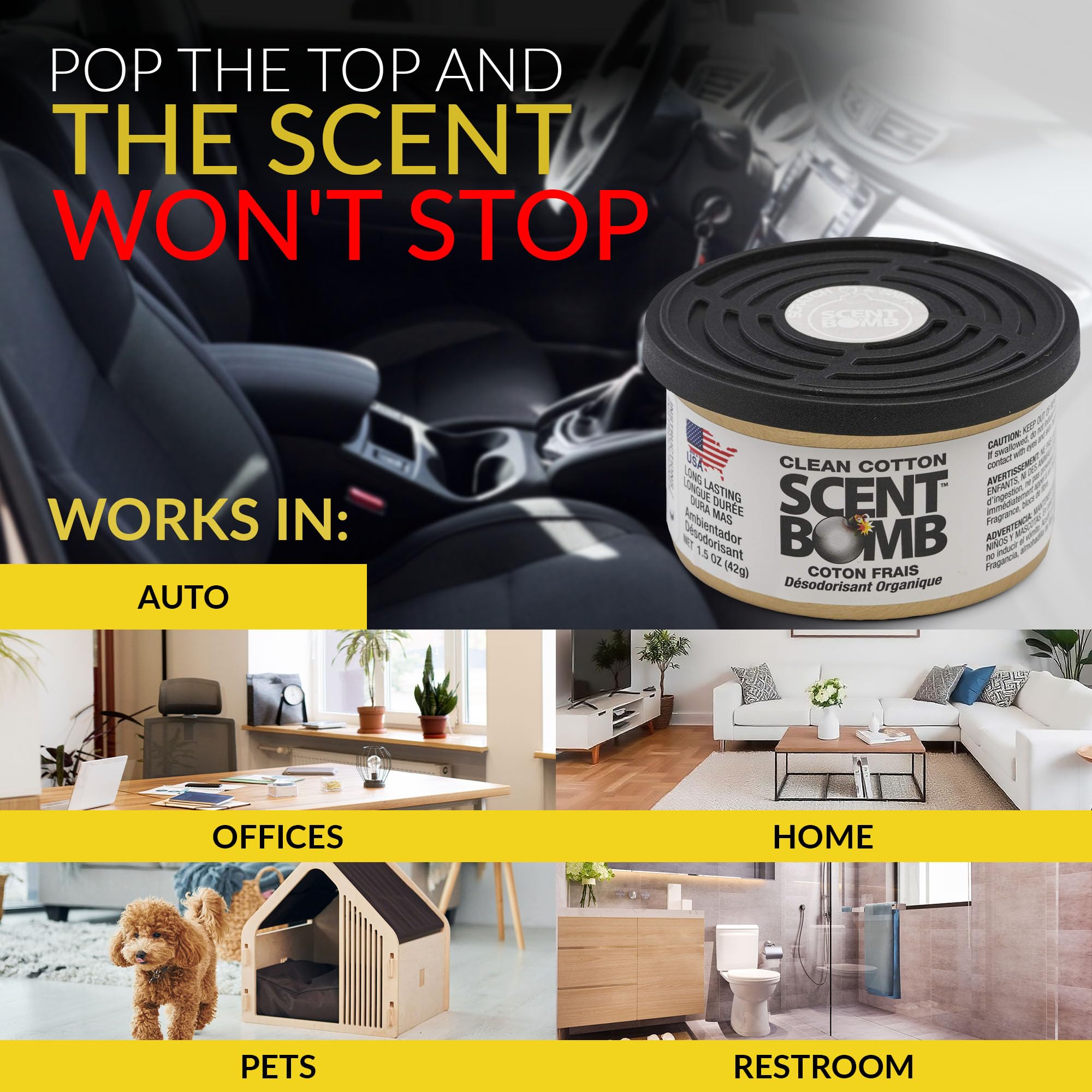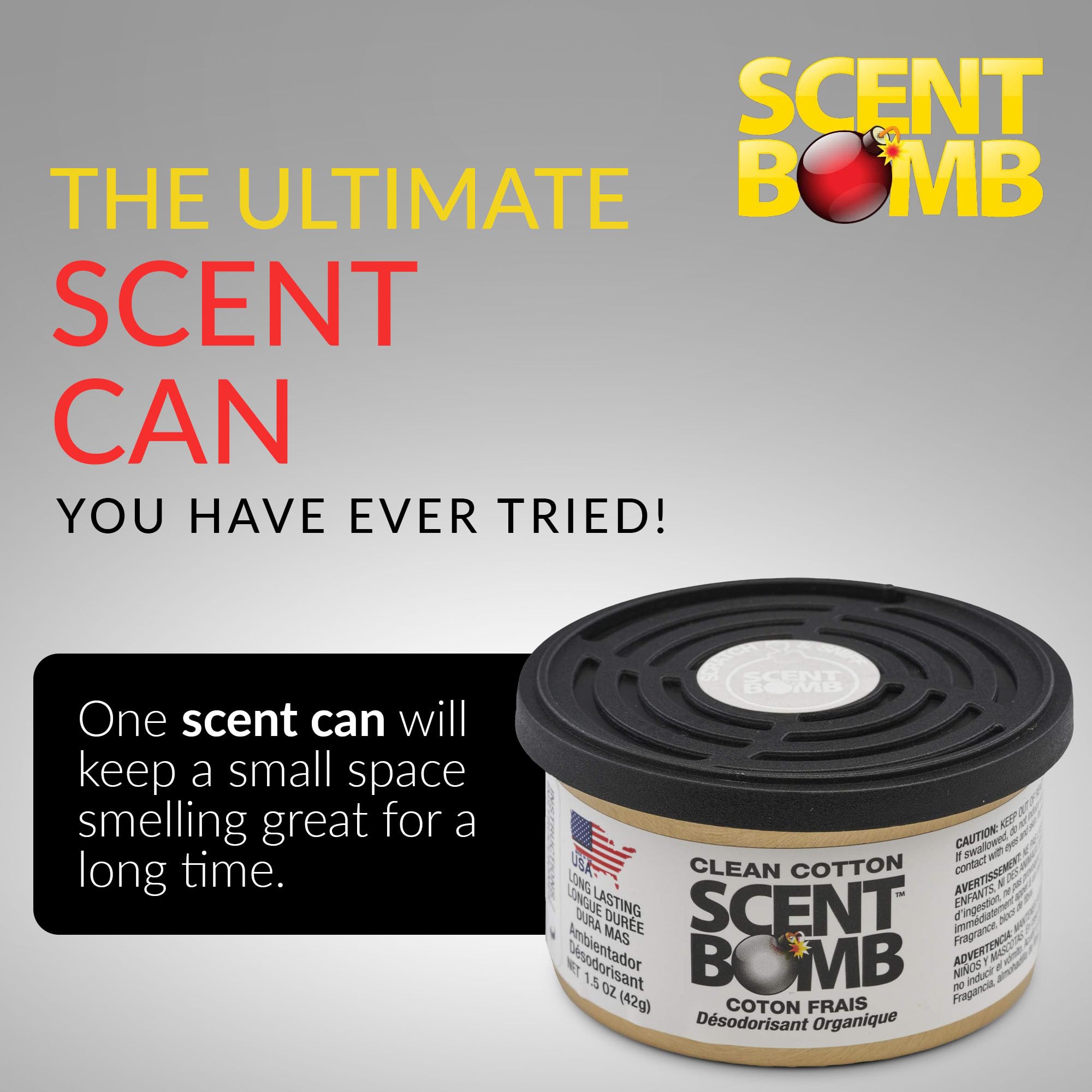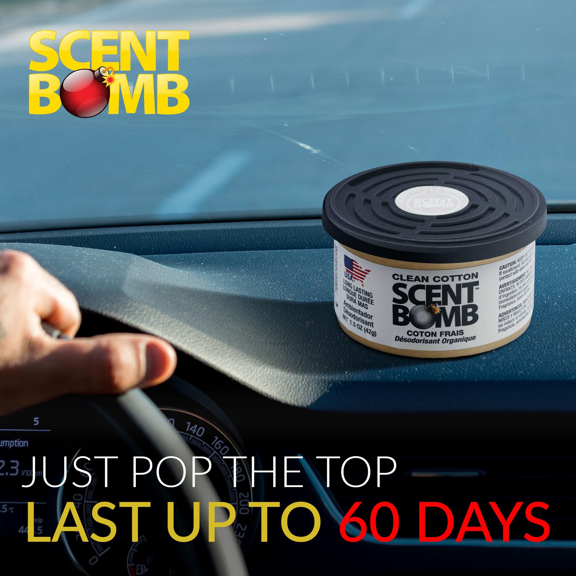 LONG-LASTING ORGANIC FRESHNESS: Each Scent Bomb Organic Can delivers powerful, long-lasting fragrance to eliminate odors, using organic, non-toxic ingredients. Perfect for cars, homes, offices, and more, for continuous freshness wherever you go.