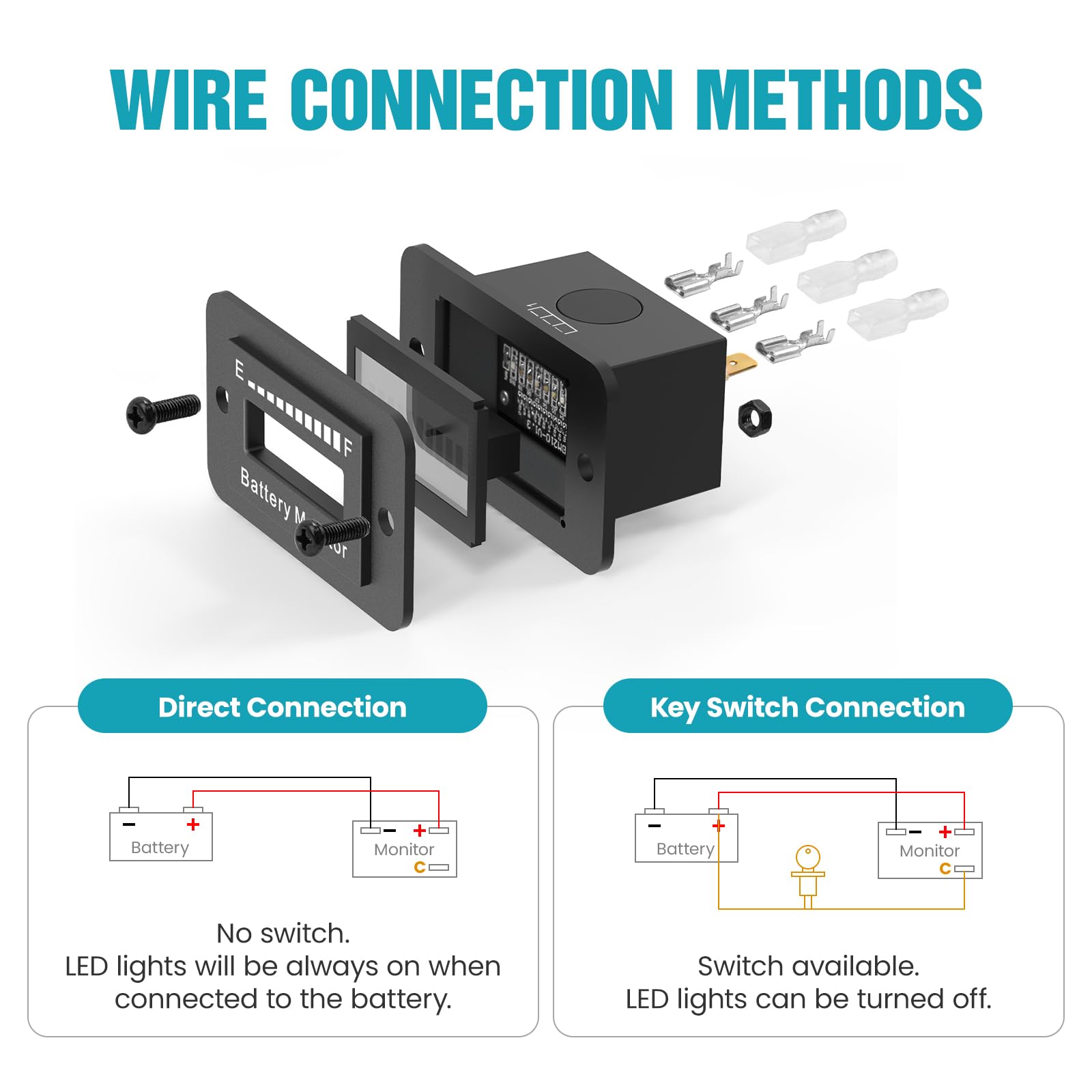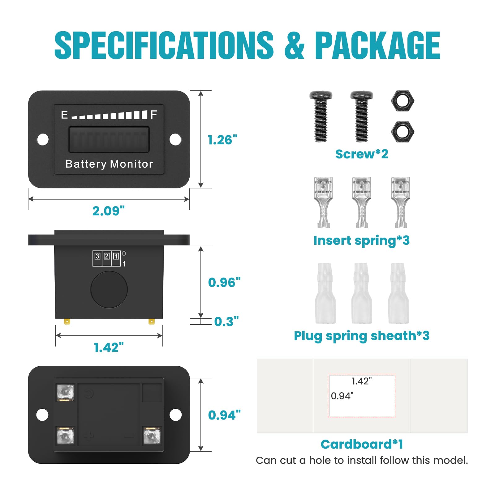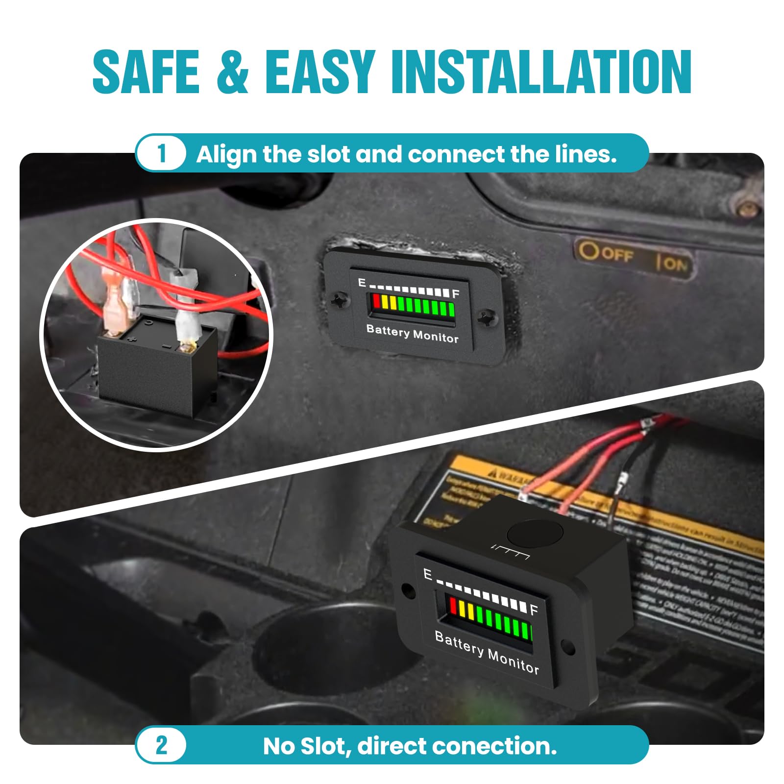 How To Install: You can drill a precise panel cutout size 37x25 mm (1.5x 1 inch) in the proper location of the car for installation or install directly into the slot (if your car happens to have this slot). The battery capacity gauge has 2 connection methods (key switch, keyless switch). Just connect the battery, no external power supply, plug and play.