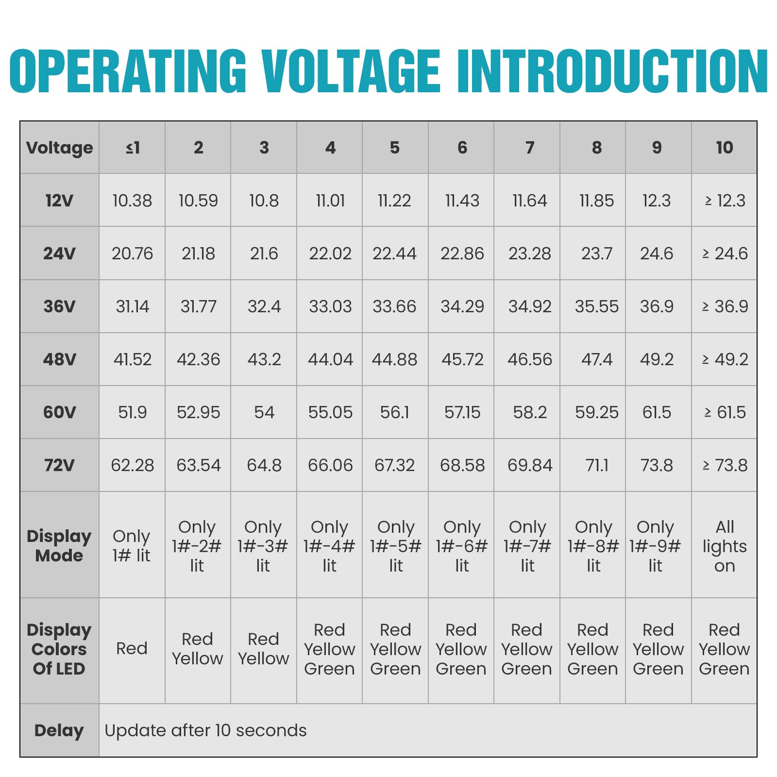 Clear and Easy-to-Read Display: The battery meter designed for battery powered device to state the remain battery capacity; 10 segment LED Bar Graph display, 10% per segment(1 red, 2 yellow,7 green).