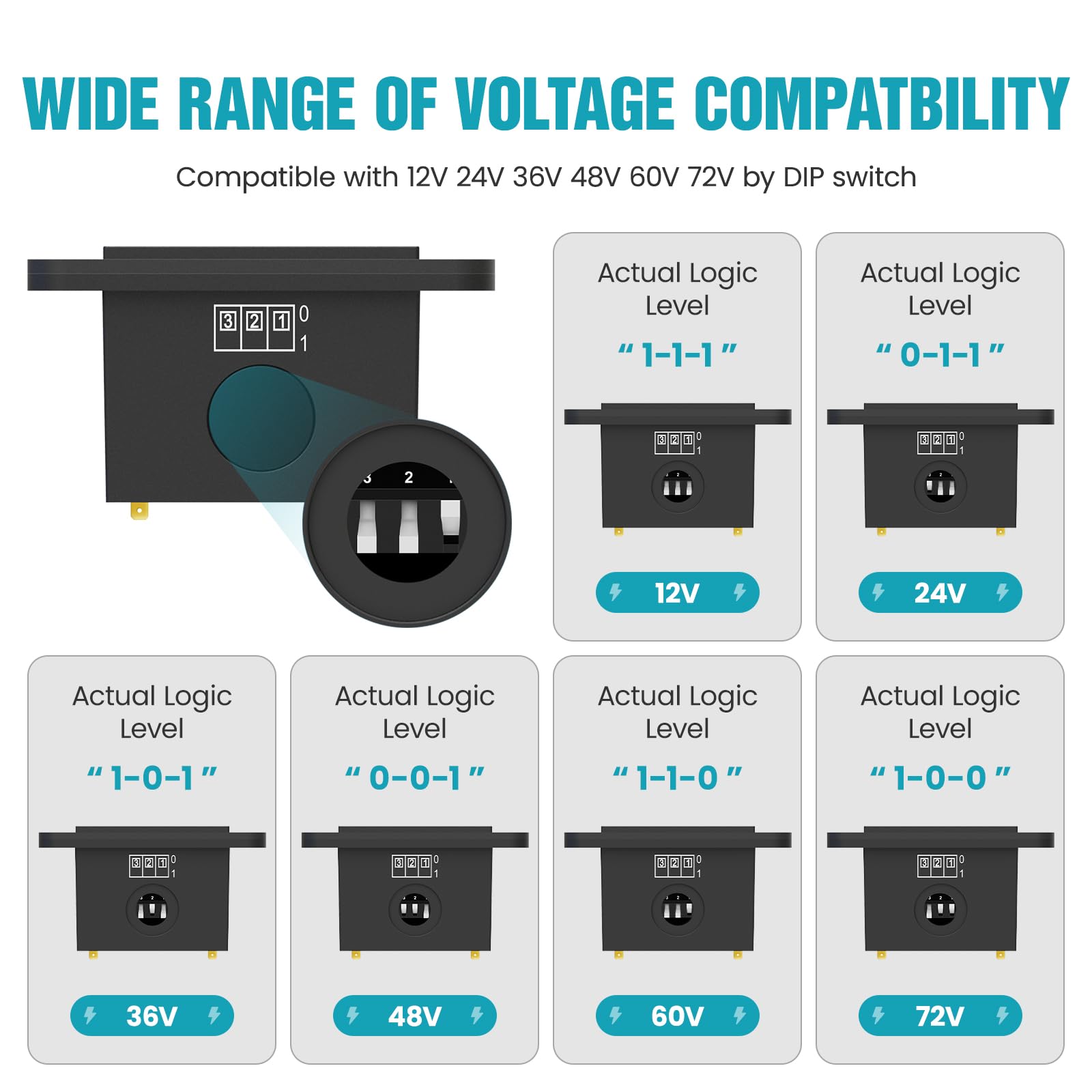 Wide Applications: Compatible with 12V, 24V, 36V, 48V, 60V, 72V (freely selectable) various Battery-powered devices, suitable for electric vehicles, golf carts, club cars, sightseeing cars, tour buses, boats, marines, scooter, forklifts, and more.