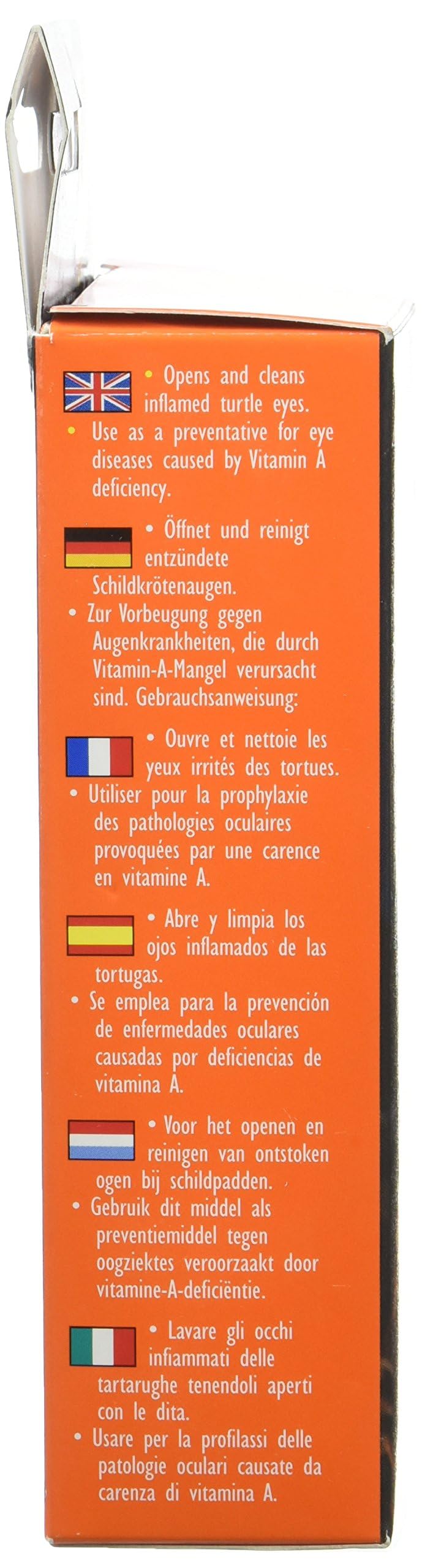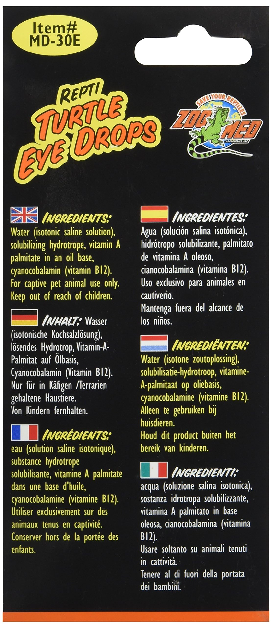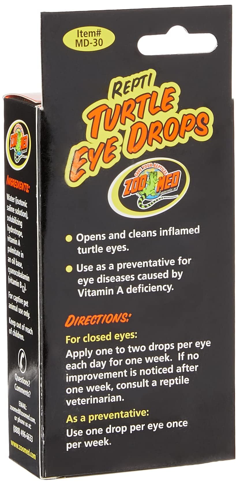 Opens and cleans inflamed turtle eyes. Use as a preventative for eye diseases caused by vitamin A deficiency. Especially helpful with box turtle eye problems. Ingredients - Water, Isotonic Saline solution, solubilizing hydrotrope, vitamin A palmitate oil base, cyanocobalamin (Vitamin B12).
