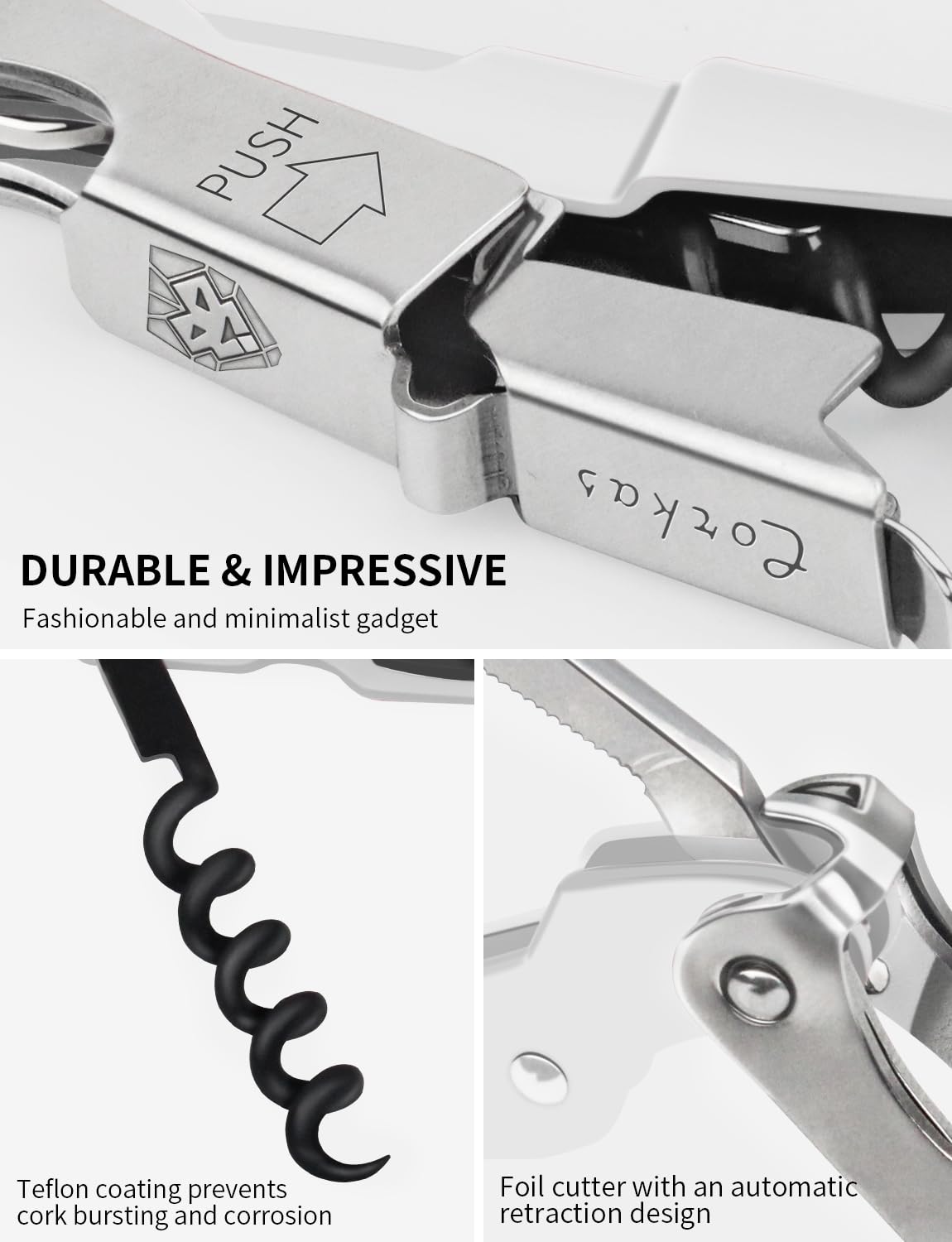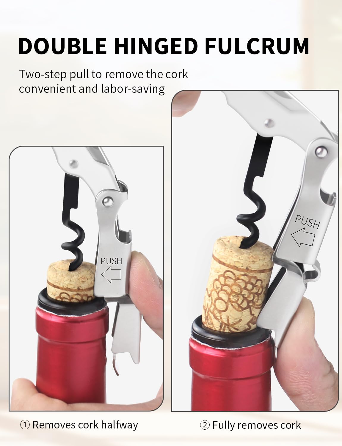 ✅【EFFORTLESS WINE EVERY TIME】Effortlessly glide through any cork with the CORKAS waiters corkscrew. The double-hinged fulcrum provides extra leverage for smoother extraction to ensure smooth, frustration-free uncorking. Its Teflon-coated worm could reduces friction and noise, easier to glide through corks, minimizing wear and tear, No more crumbled corks or wasted time – just perfectly extracted wine, ready to be enjoyed.