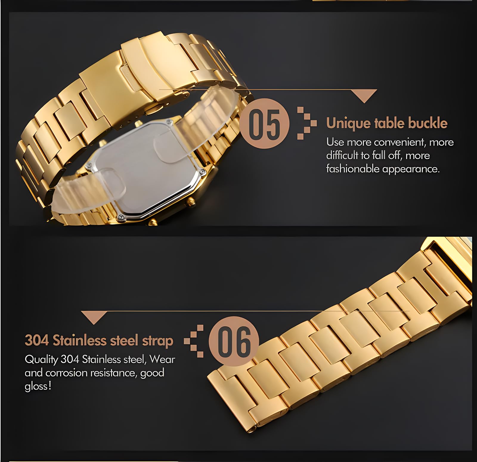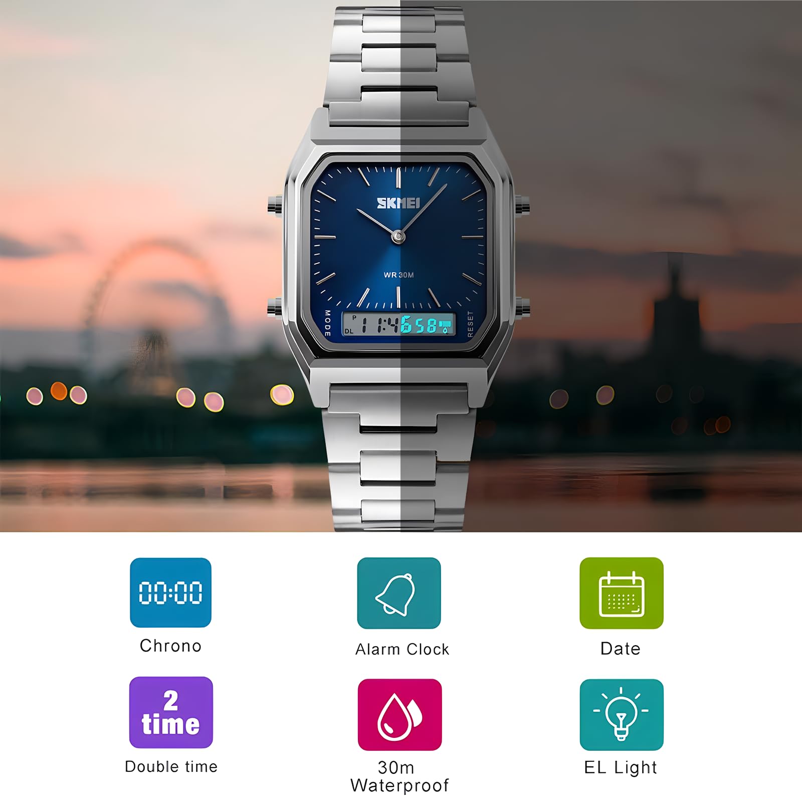 Description Gender: Men Style: Simple,Fashion,Sport Taiwan IC movement Colors: Rose Gold,Gold,Silver,Blue,Black Case Material: Zinc Alloy Band Material: Stainless Steel Strap Buckle type: Buckle Watch of Dial: square Dial Diameter: 33mm Case Thickness: 11mm Band Width: 22mm Water Resistance Depth: 30ATM Functions:Dual Display,EL Light,Date,Chronograph,Alarm Features:Double Display,Digital Quartz Watch,Waterproof