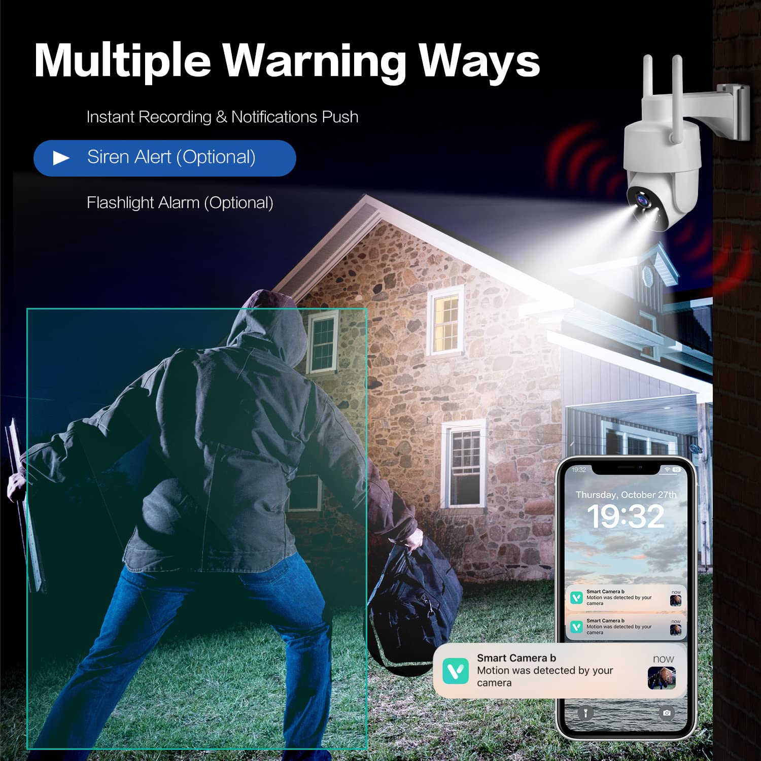 【Instant Siren Alarm & Smart AI Motion Detection】This outside camera can flash bright lights, sound alarms, and send instant notifications. Intelligent AI analysis technology to effectively identify humans, pets, vehicles, and packages. You could choose to receive notifications only for items you care about. Check the status of pets, prevent packages from being stolen, and protect the safety of your family's property.