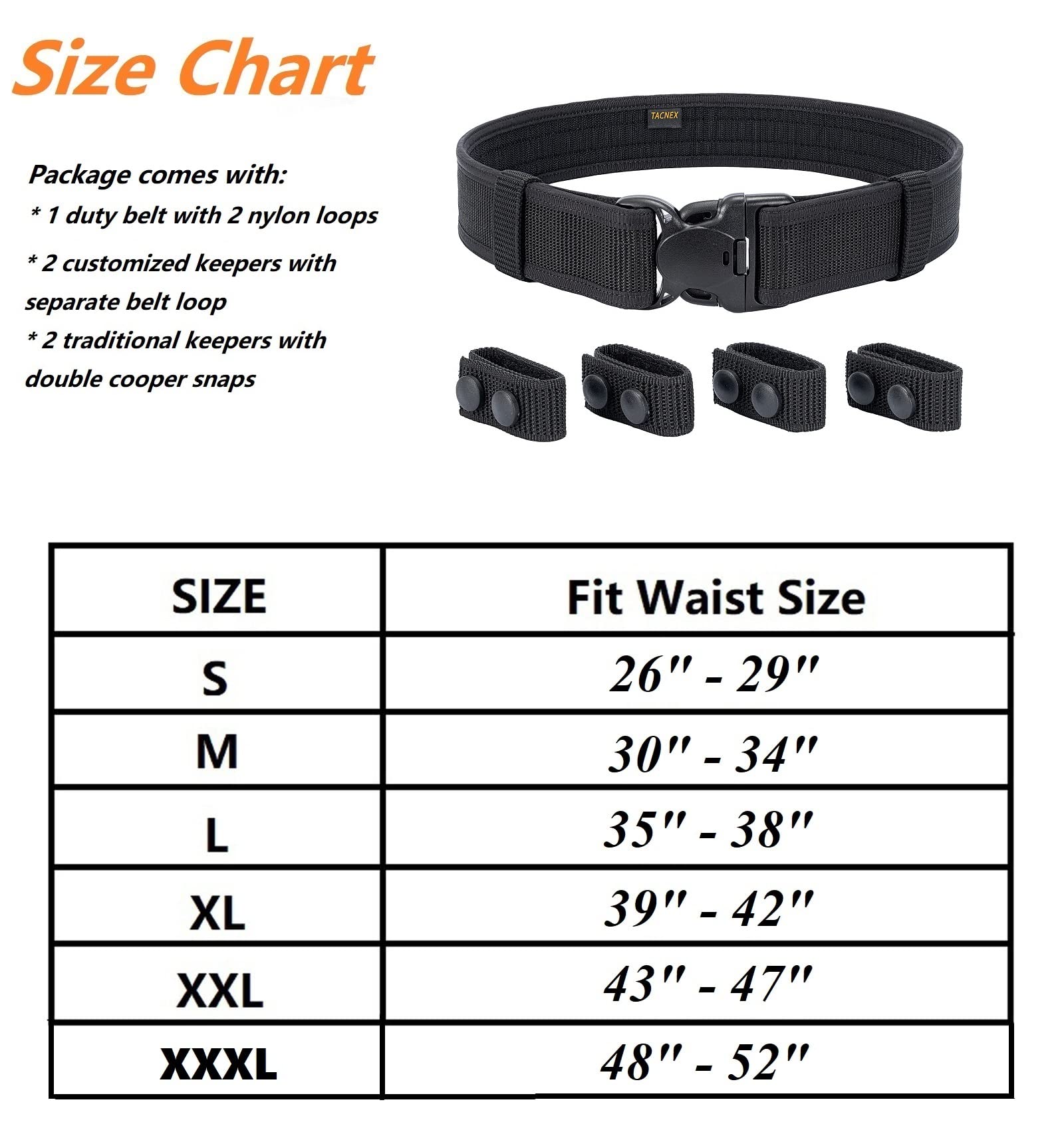 TACNEX duty belt is reliable&professional enough for any law enforcement or security. It's primary used for police men/women, cop, correctional officer, sheriff, public safety professionals, constable, security guard, private security, and beginner for police academ training so that they can be prepared in an instant and easy access to all work tools. We also provide 4 heavy duty nylon belt keepers w/ double copper snaps & loop inner lining for you to fasten the inner belt or hold other gears.