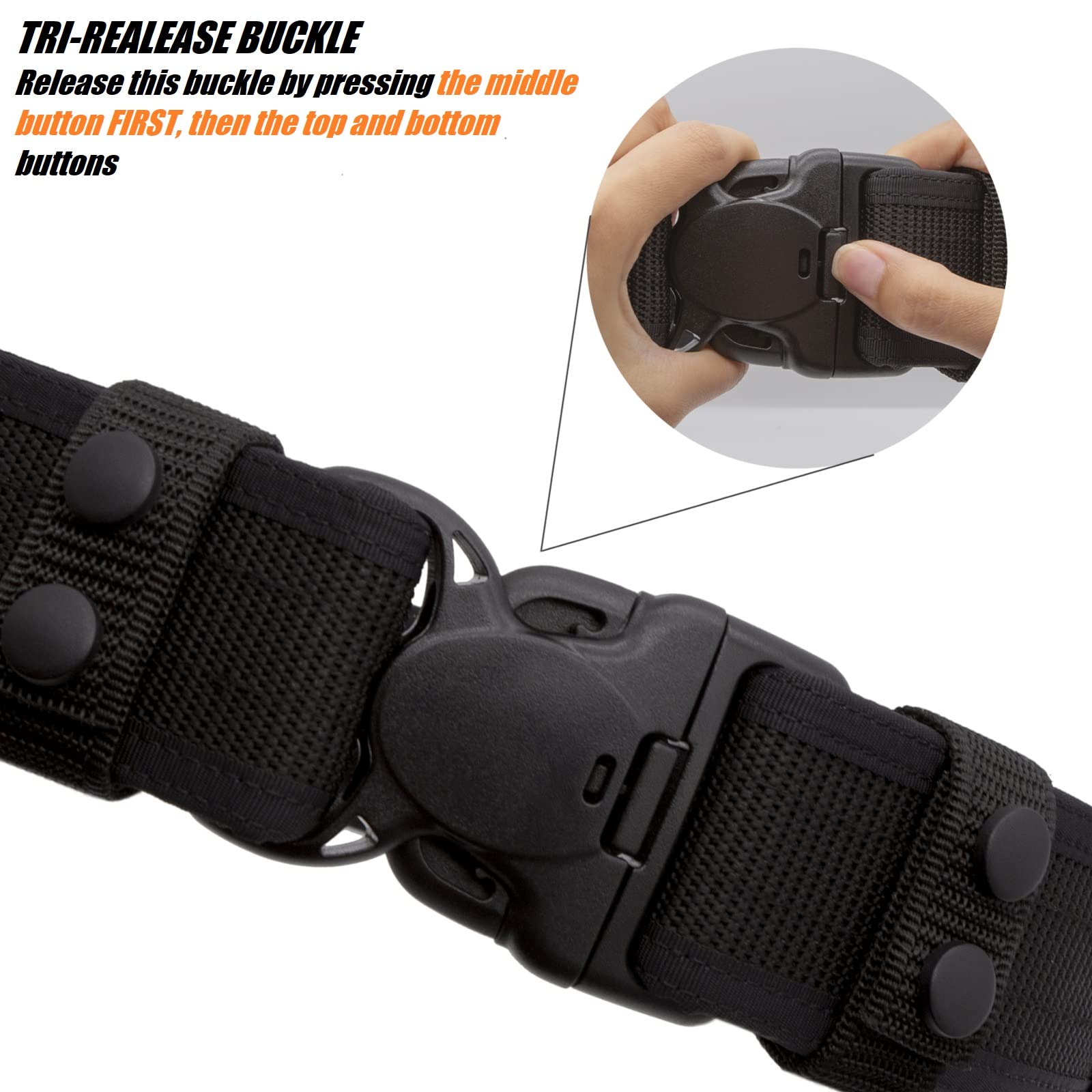 Easily Adjust Size with the hook&loop closure on both end of the belt. Only loosen the hook&loop tabs on the inside of the belt, put them back through the buckle, then remold it to the buckle. It is a stiff belt so it takes a little bit of squishing to remold the new position of the belt to the buckle. Pro Secure UTX Triple Retention Buckle for added extra security from inadvertent release, shatter-resistant. Release this buckle by pressing the middle button first, then the top & bottom.