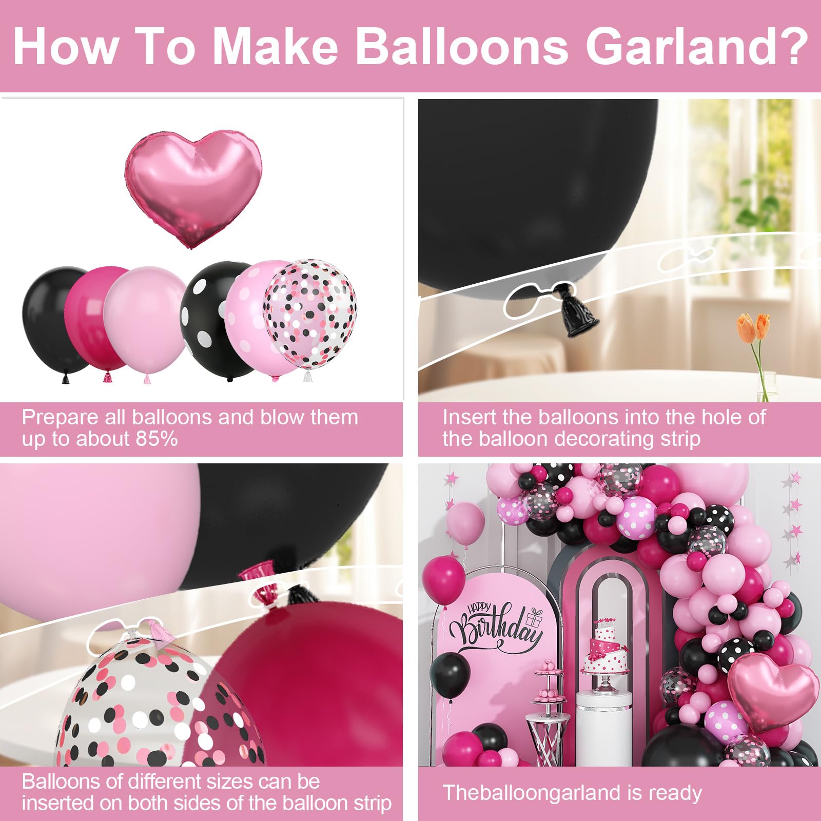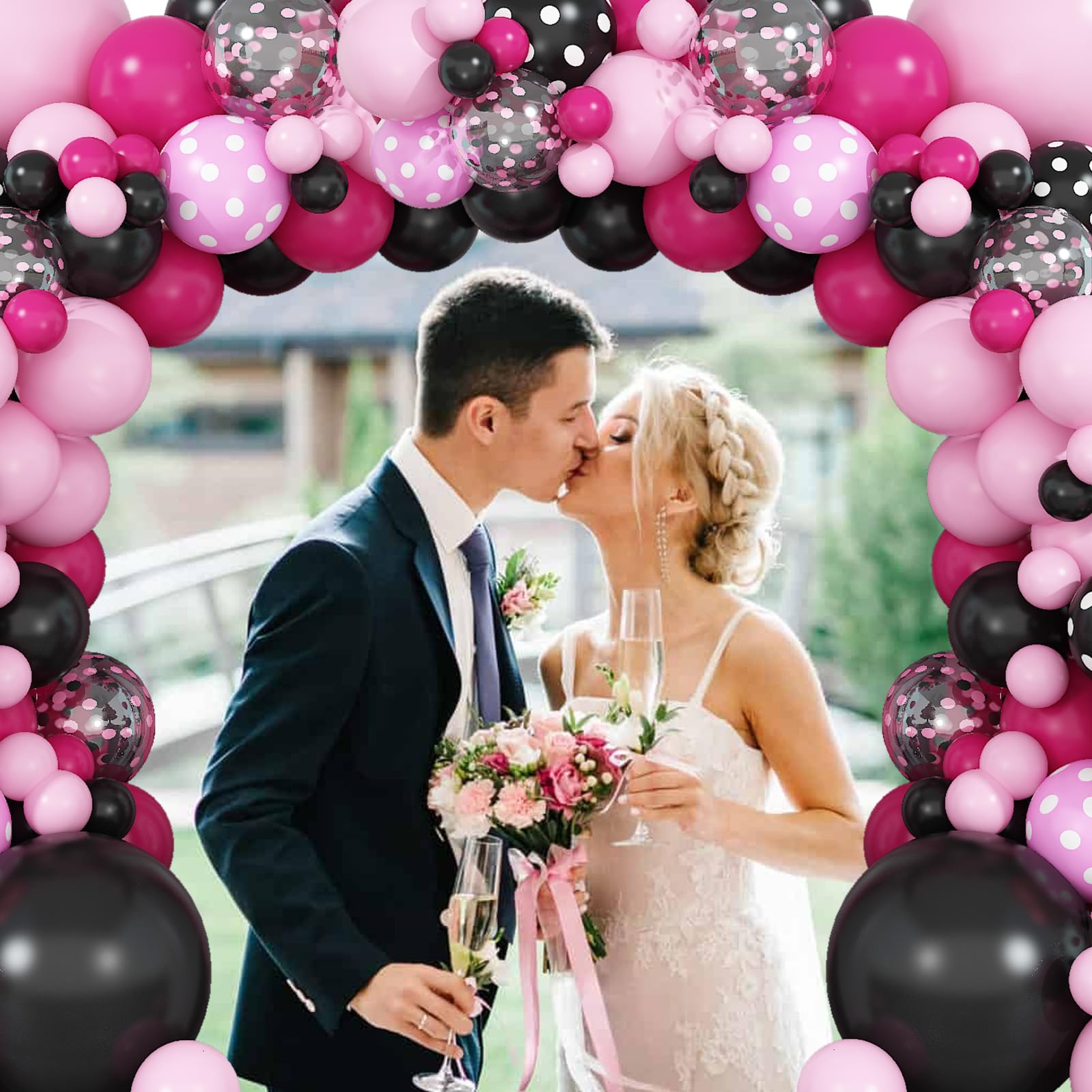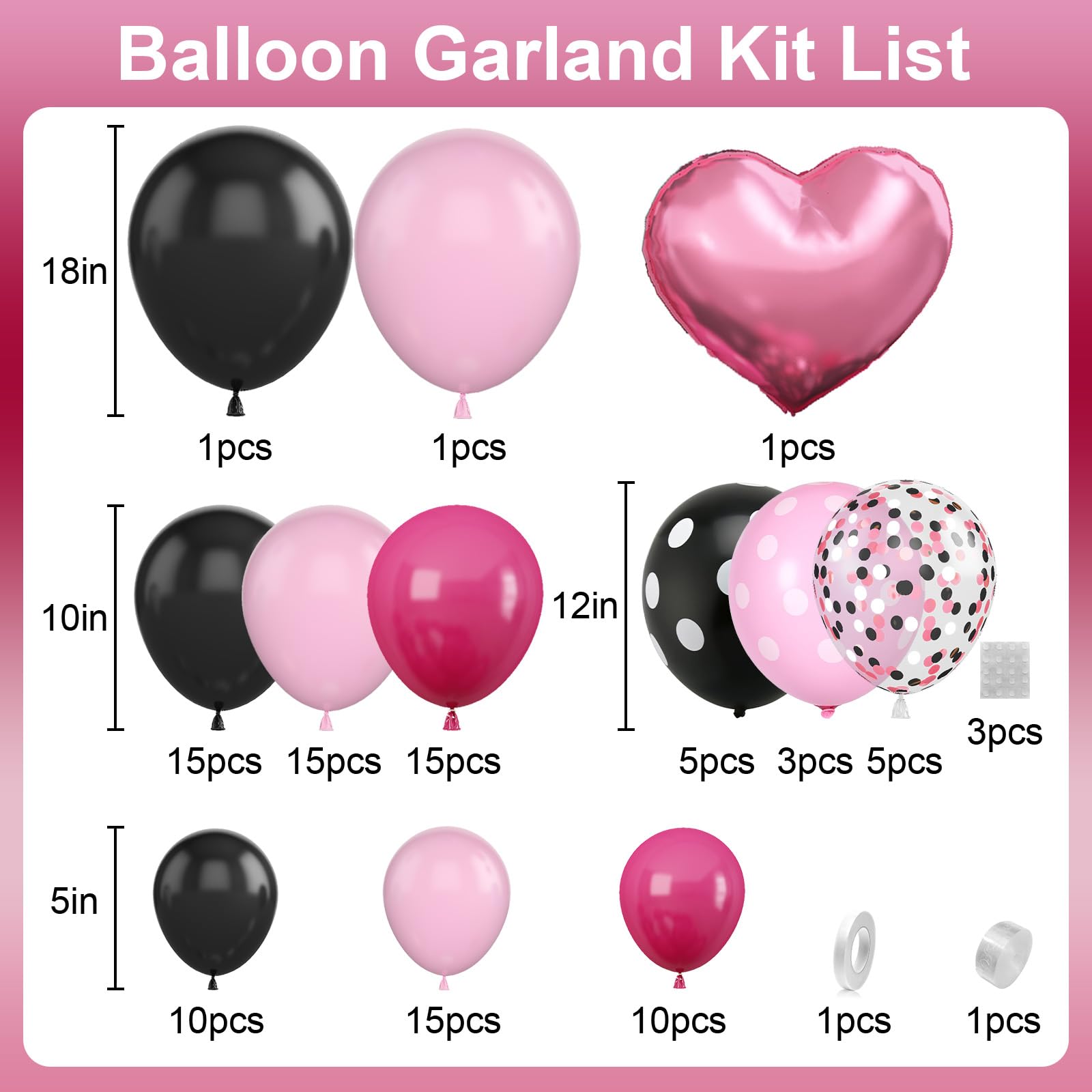 【Pink Black Balloon Arch Kit】The pink black balloons garland kit consists of 5/10/12/18-inch latex balloons, including black balloons*36, pastel pink balloons*31, rose red balloons*25, love foil balloons*1, black polka dots balloons*5, polka dot pink and white balloons*3, pink black confetti balloons*5, large pink aluminum foil bow balloon, 5m balloon chain, balloon dispensing glue, 10m balloon ribbon.