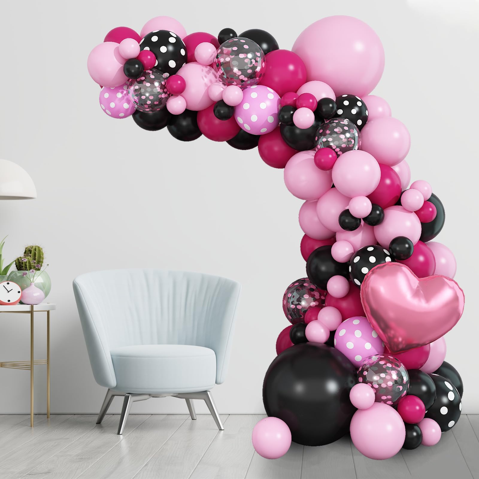 Pink Black Balloon Arch Kit, Pastel Hot Pink Black Dot Balloon Garland with Bow Heart Foil Balloons, Pink Black Theme Balloon for Girls Kids Birthday Baby Shower Wedding Party Decor
