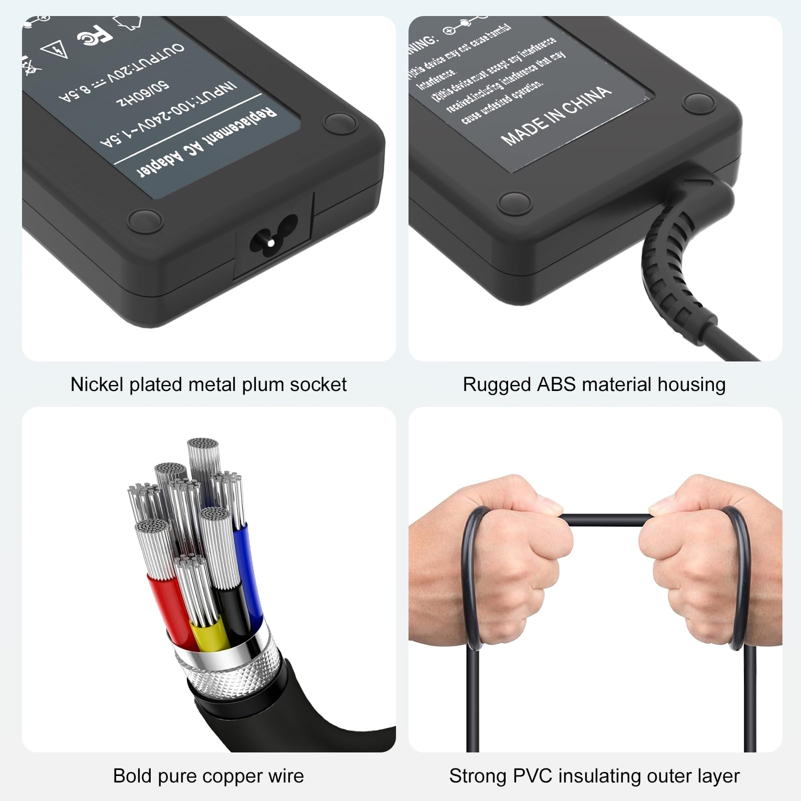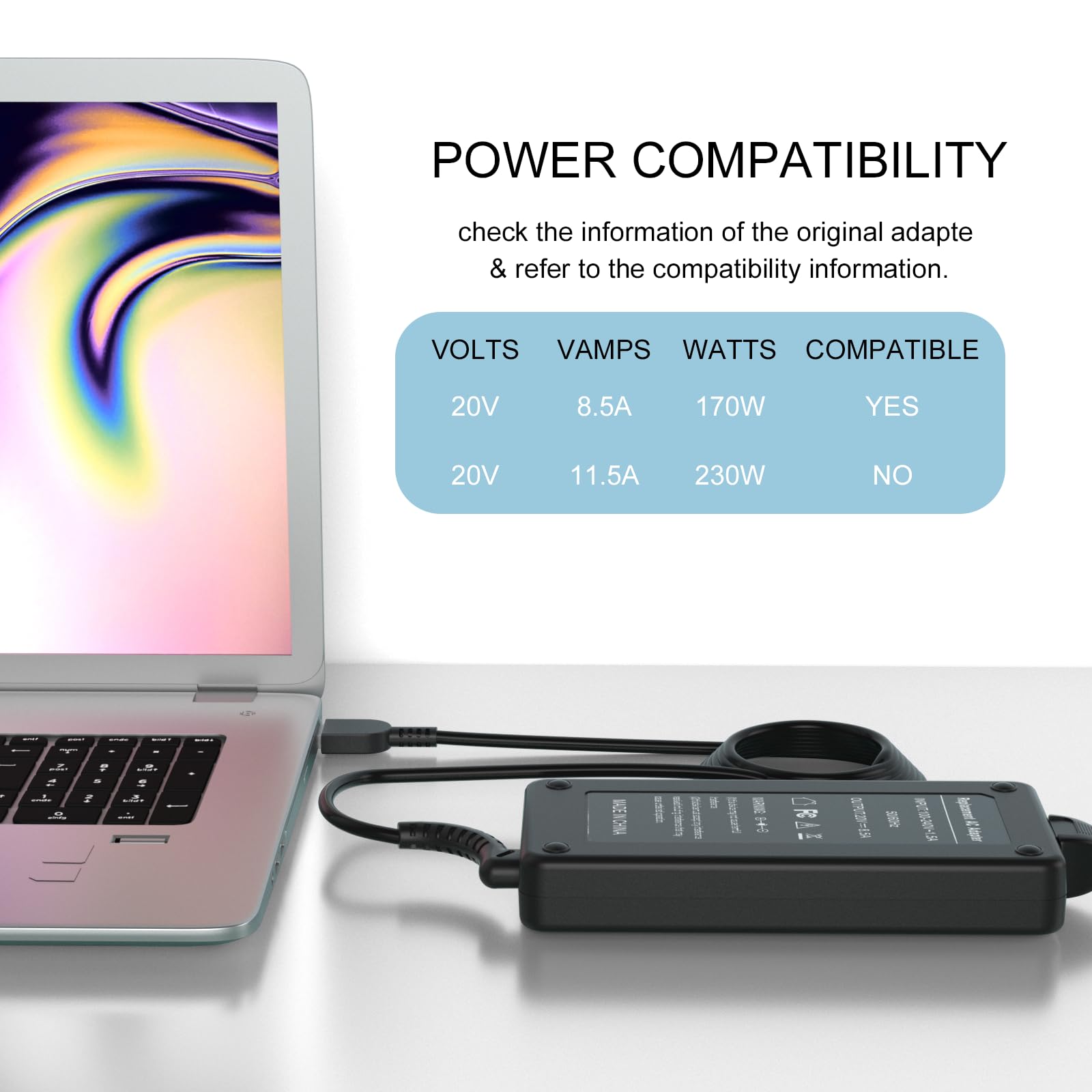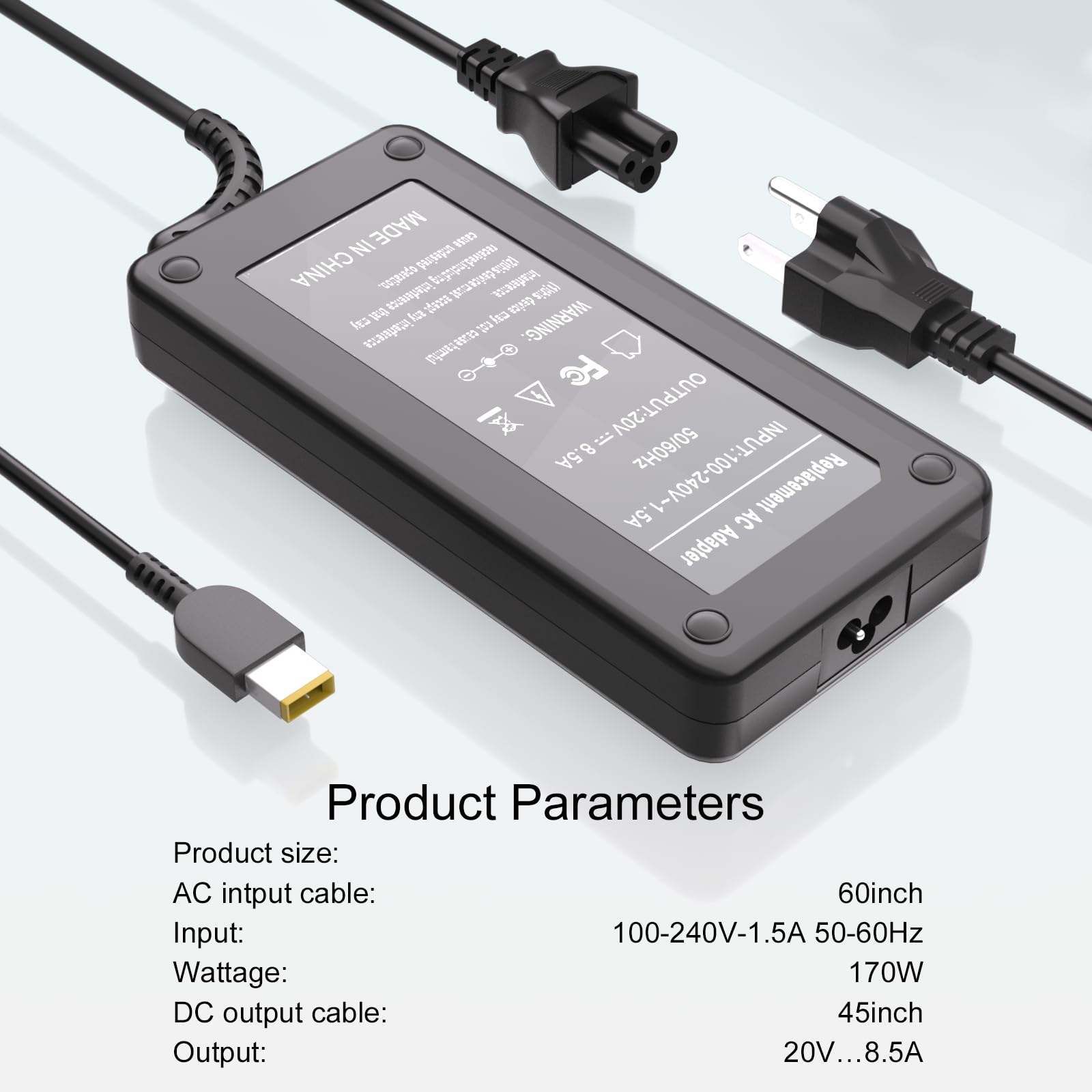 Output Max: 170W 20V 8.5A (also fit for 135W 20V 6.75A)/ Input Volt Range: 100-240V / Connector Size: Square Yellow Tip