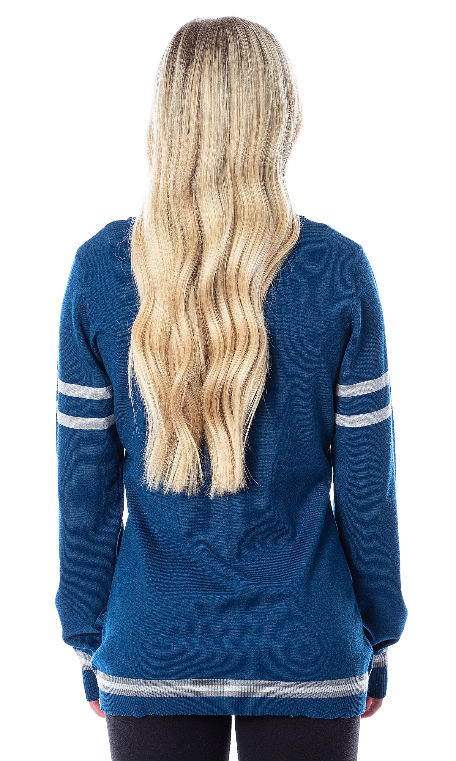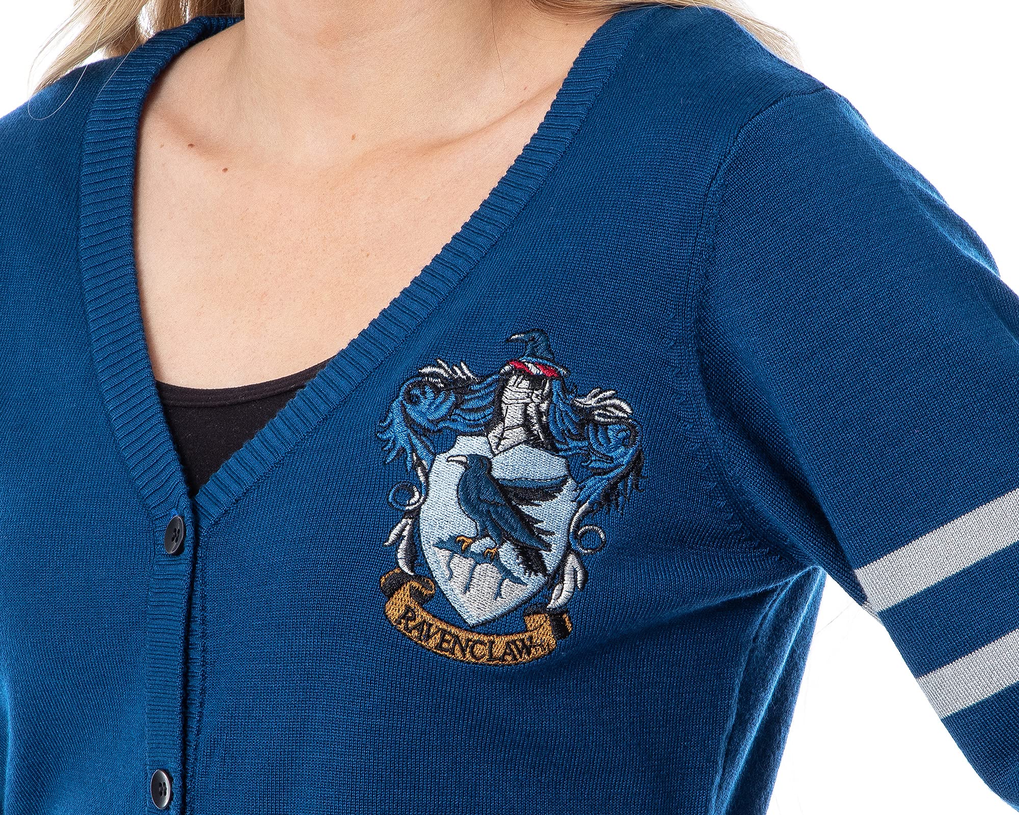 RAVENCLAW HOUSE CREST CARDIGAN - This Harry Potter Ravenclaw open-front cardigan has the house crest stitched on the chest. A varsity-style blue sweater with grey stripes at the sleeves and two-toned grey stripes at the waist. Six buttons are located on the front of the cardigan for closure