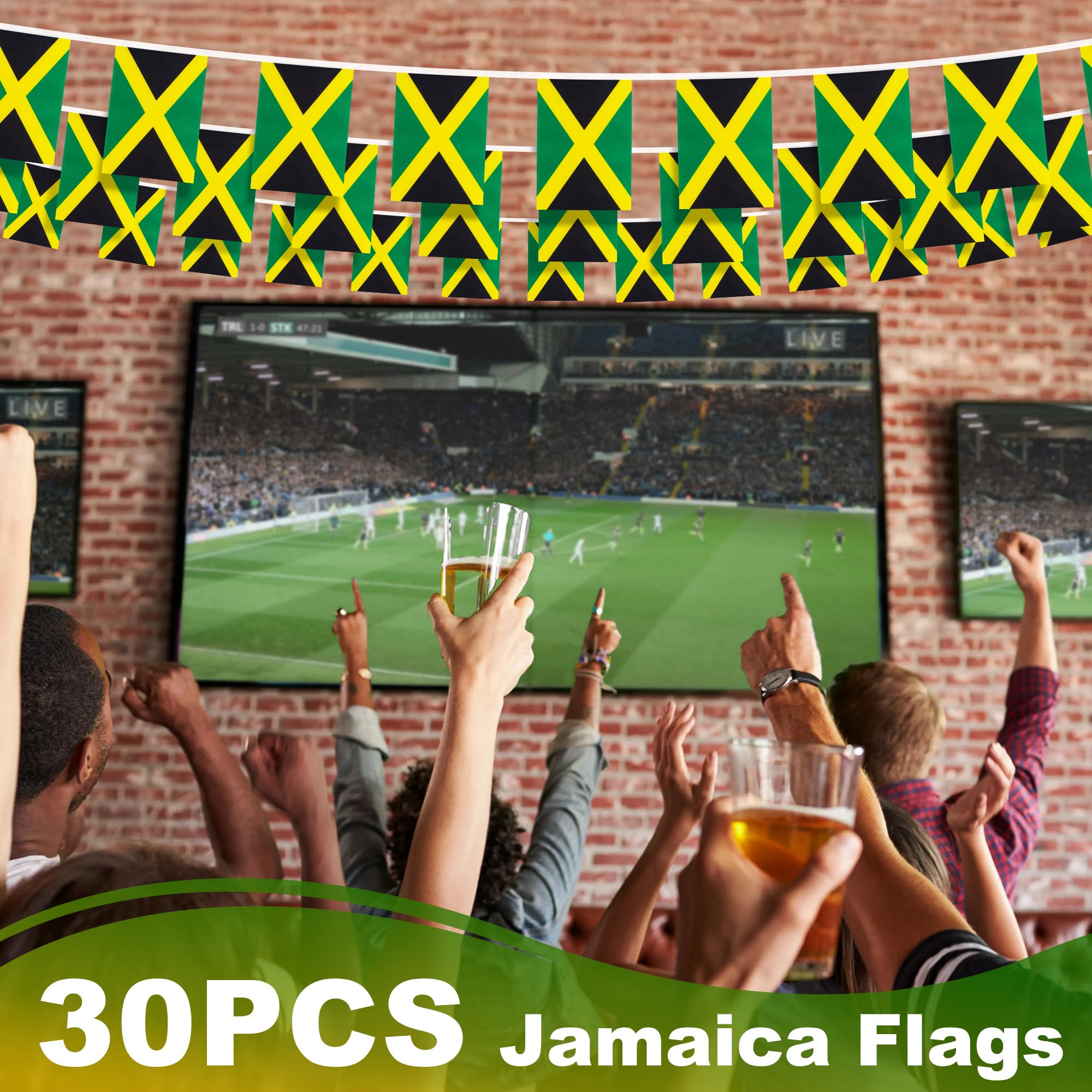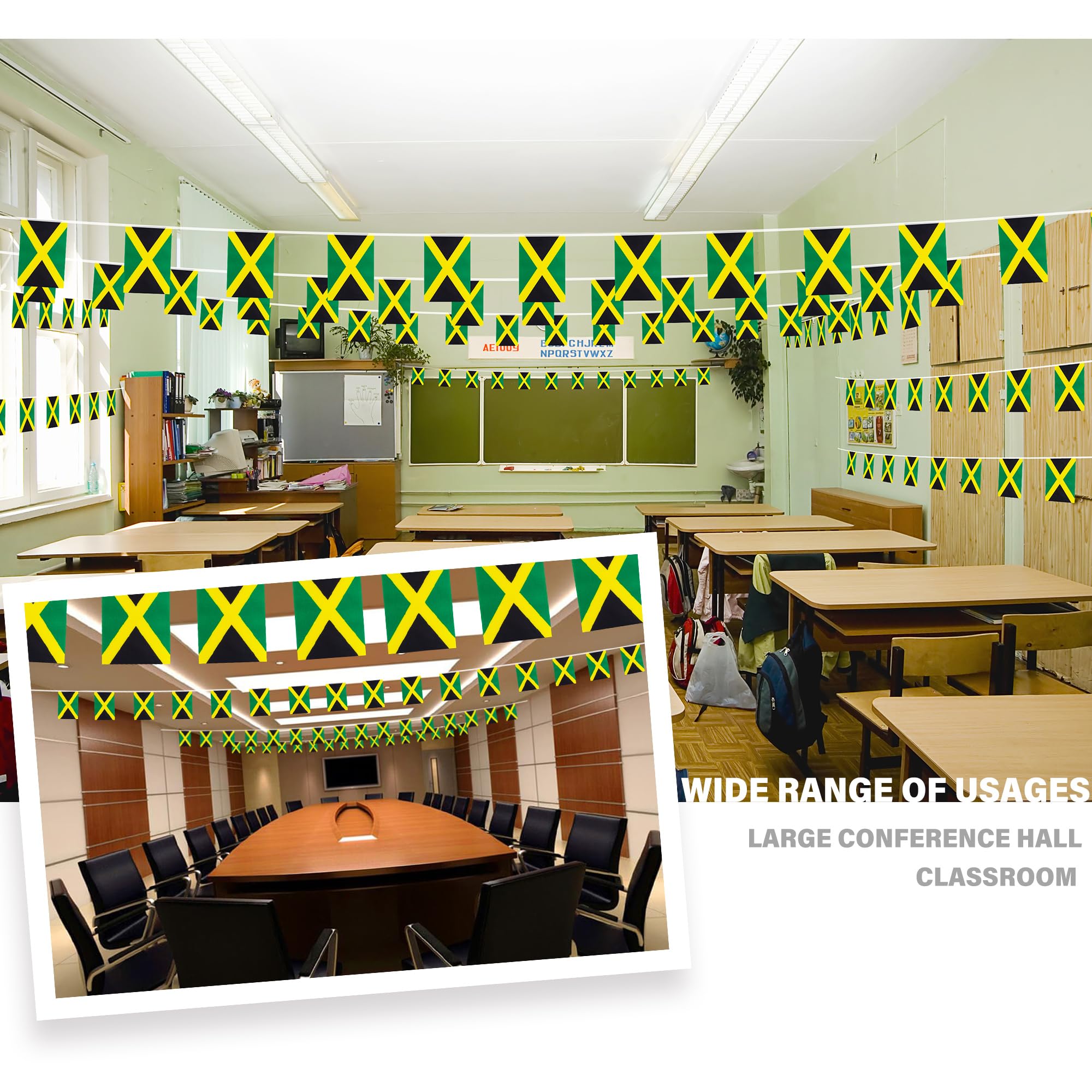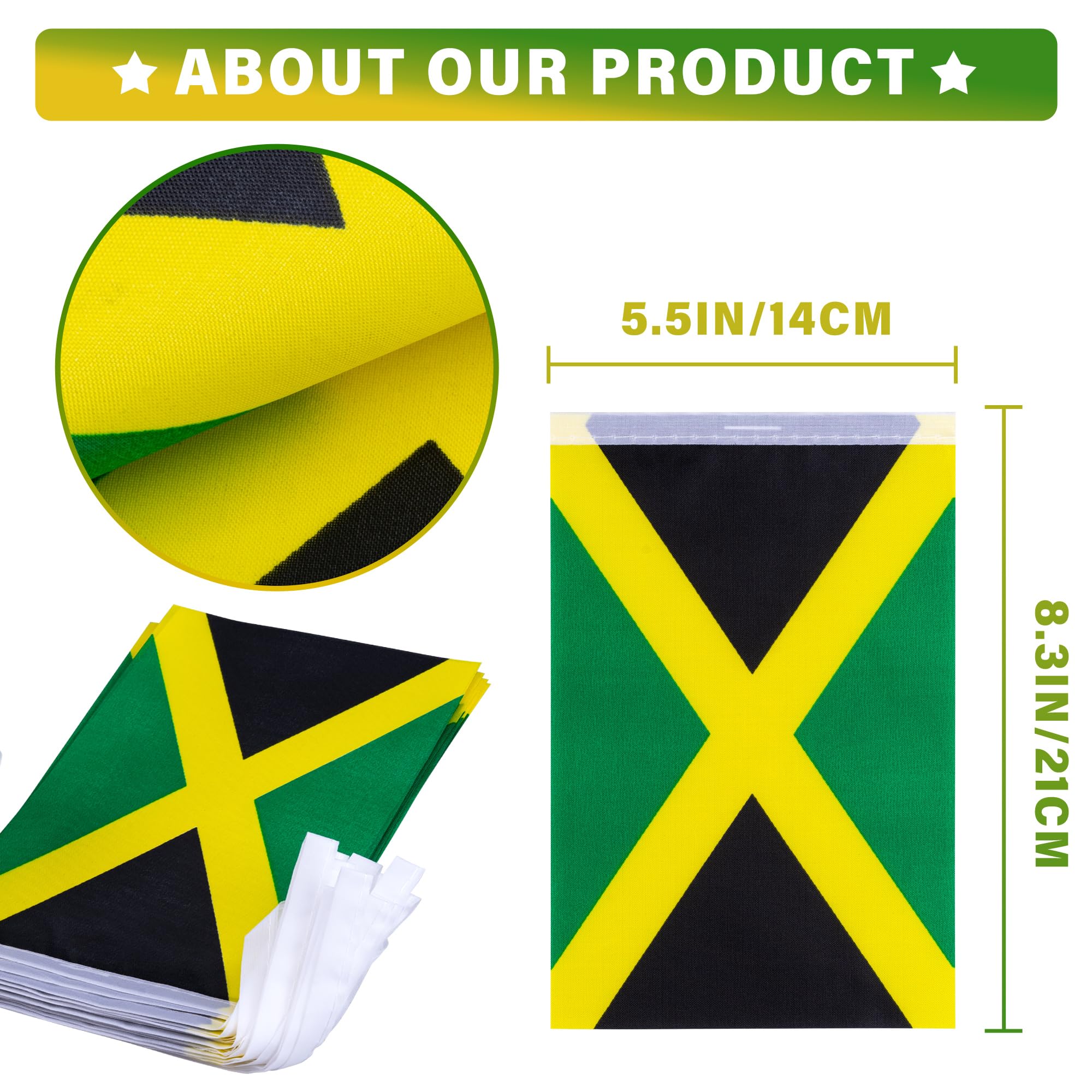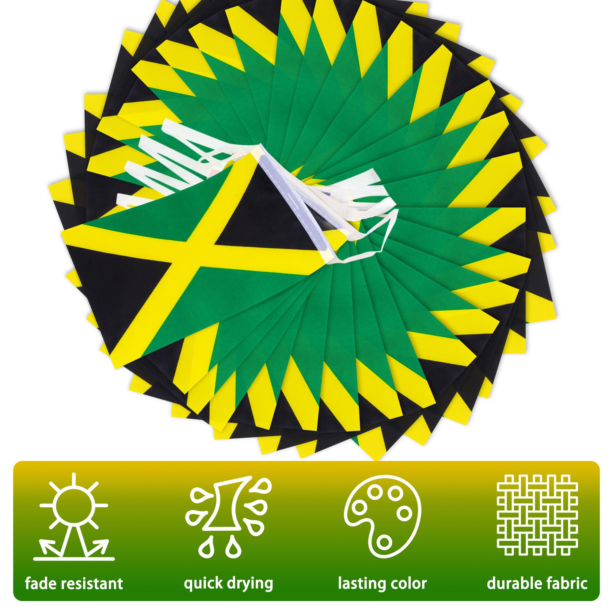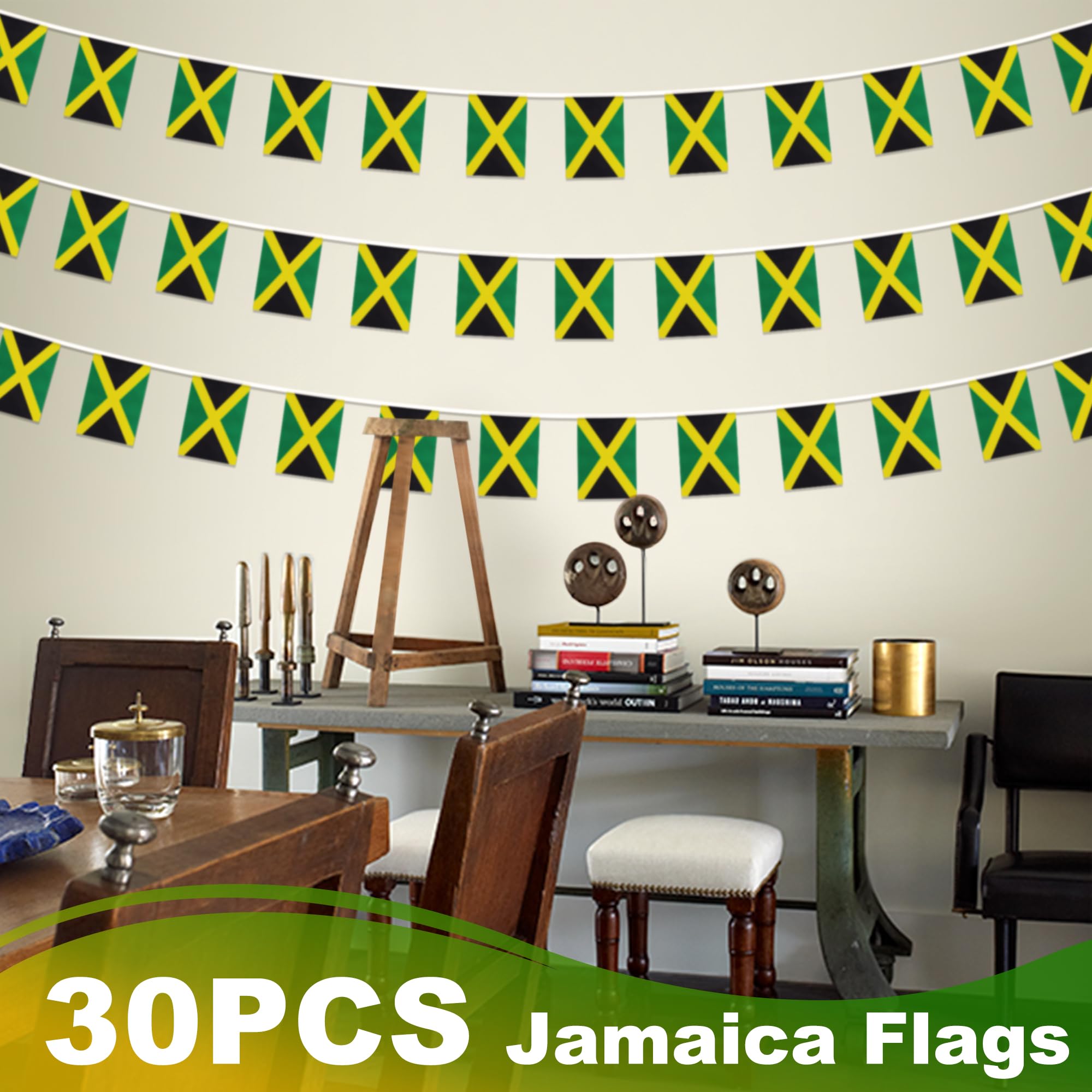 【Specifications】Each string is approximately 33 feet long. Includes 30 pcs Jamaican flags. Each flag is approximately 5.5 in wide and 8.2 in long.