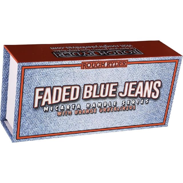 All the knives in the Rough Ryder Faded Blue Jeans Series feature mirror polished 440A stainless steel blades with match strike pulls and half stops. The handles are denim micarta with brass liners and nickel sliver pins and slant 'R' bolsters. This Rough Ryder Faded Blue Jeans Micarta Work Knife features drop point blade. It's 4.75" closed, 8.5" overall, and weighs 3.8oz. Rough Ryder is always built by hand and backed for life.
