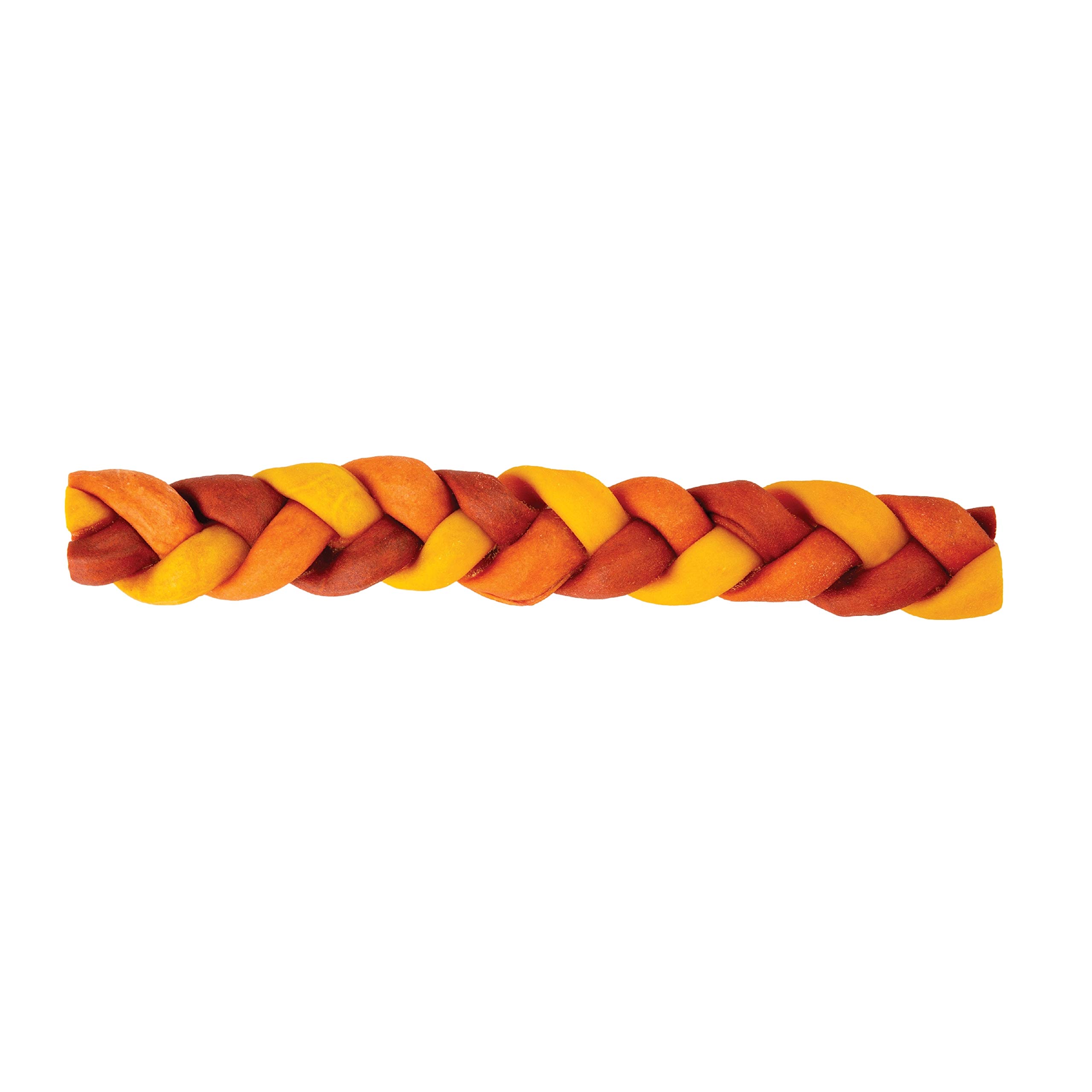 Good ‘n’ fun brand contains a savory combination of flavor that dogs love most. These delicious chew treats are made from the finest ingredients, including delicious beef hide, to create truly delightful, long-lasting treats your dog will love. Good ‘n’ fun Triple flavor braids contain a savory combination of three flavors dogs love. These delicious chews are made from long-lasting beef hide and artificial pork, chicken and peanut butter flavors to create this truly delightful, long-lasting treat your dog will love. The braided shape is unique and fun, making it a perfect snack for large-size dogs! Good ‘n’ fun Triple flavor braids are a fun and delicious way to satisfy your dog’s natural Urge to chew, while the natural chewing action helps reduce tartar buildup and remove plaque. Feed 1 chew to your dog daily and always supervise your dog while consuming.