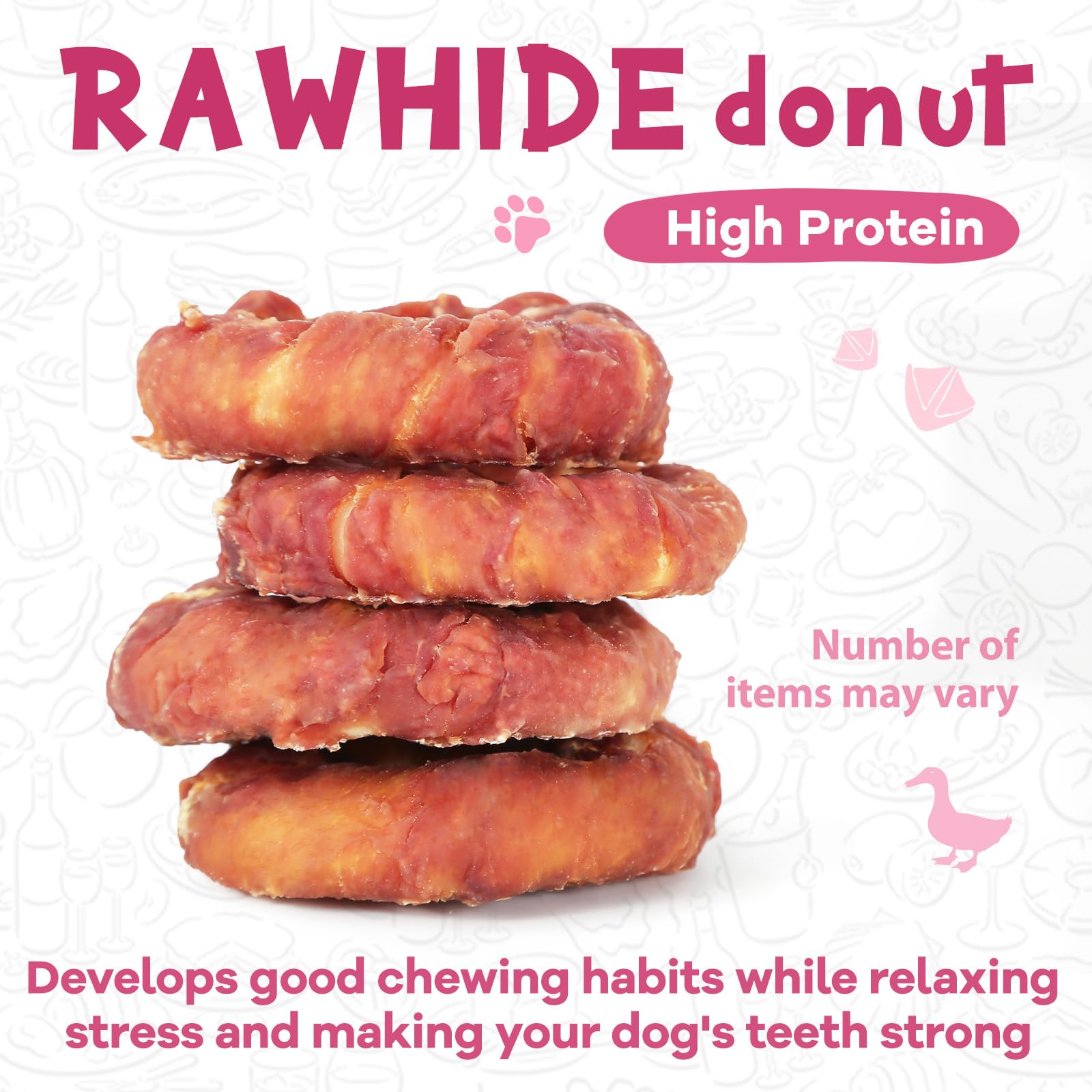 STRESS RELIEVING:Dog Treat Duck Rawhide Donut allows a long-lasting and more fun chewing for your dogs with delicious tasting. Let your puppies relieve their stress through focusing on these nutritious chews
