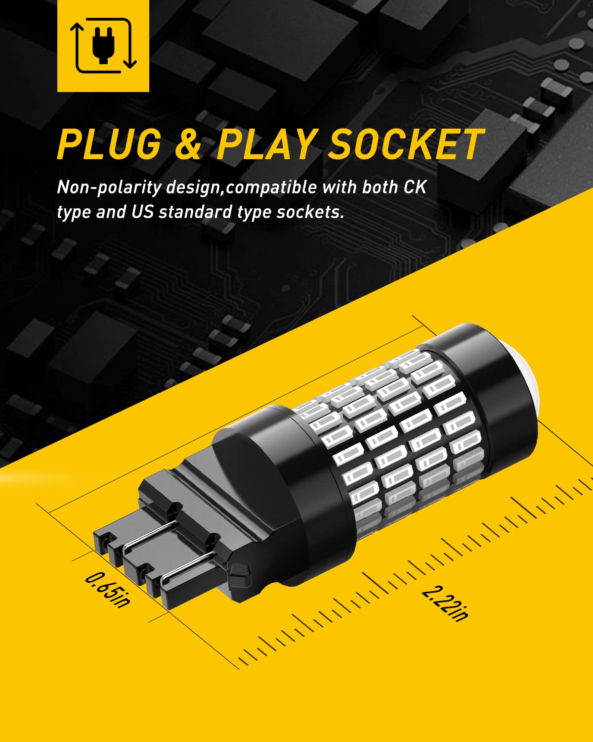 【INSTALLED IN MINUTES】Non-polarity design, plug and play easy installation. These led brake light bulbs compatible for both US standard and CK socket, fit for 3156, 3157, 3056, 3356, 3456, 4156, 3047, 3157R, 3057, 3155, 3357, 3457, 3457R, 4057, 4114, 4157, etc