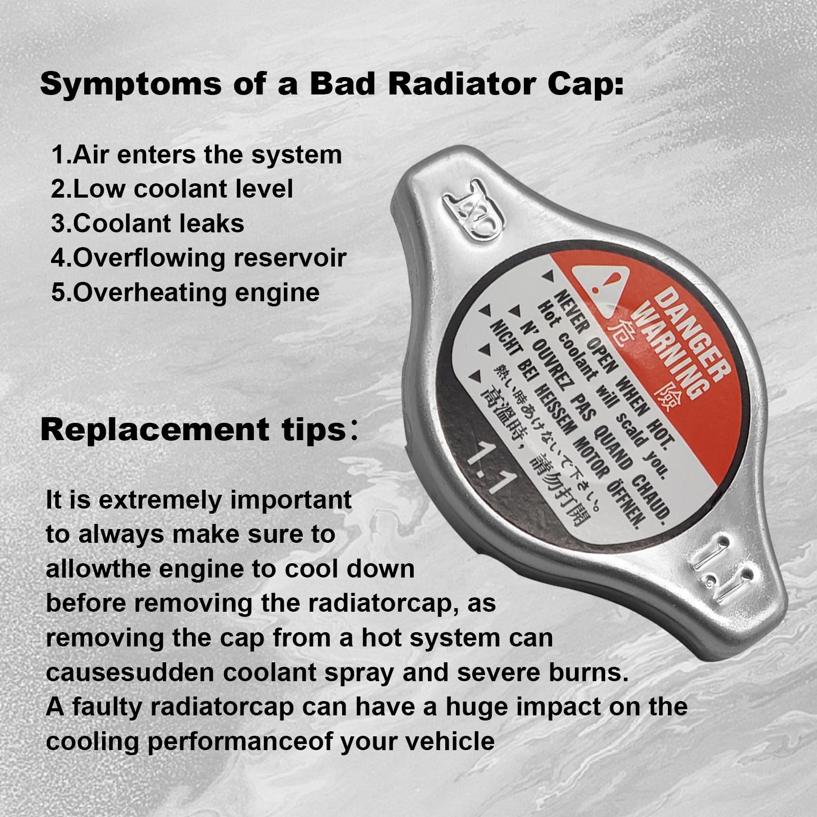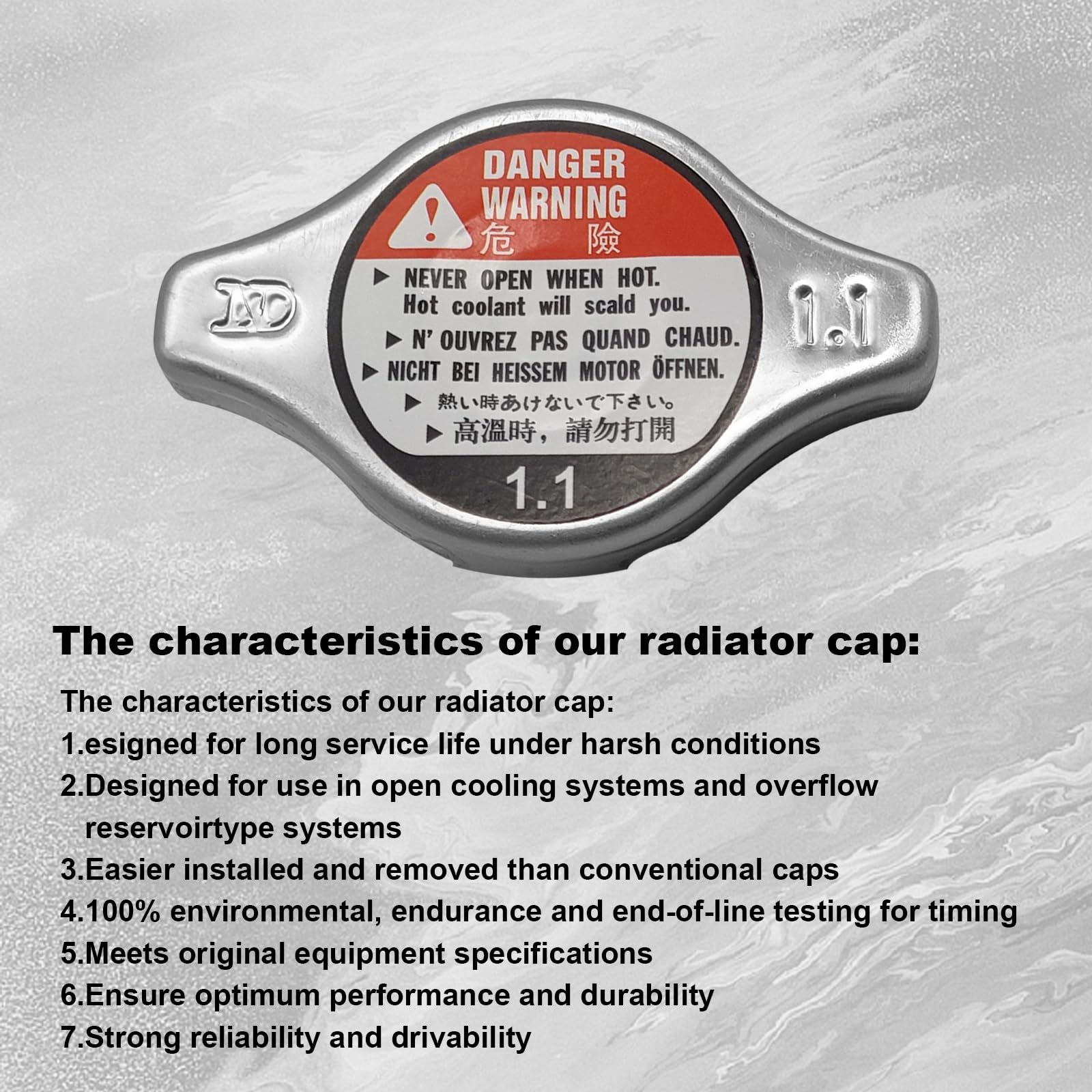 【Feature】The radiator cap also works as a two-way valve that keeps the right pressure inside so the radiator does it work correctly.Symptoms of a Bad Radiator Cap: air enters the system, low coolant level, coolant leaks, overflowing reservoir, overheating engine.